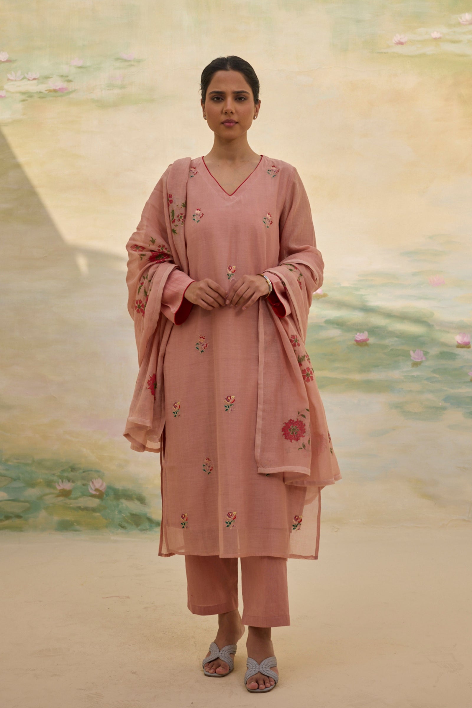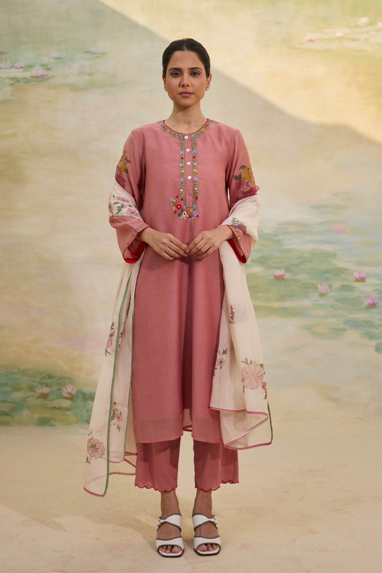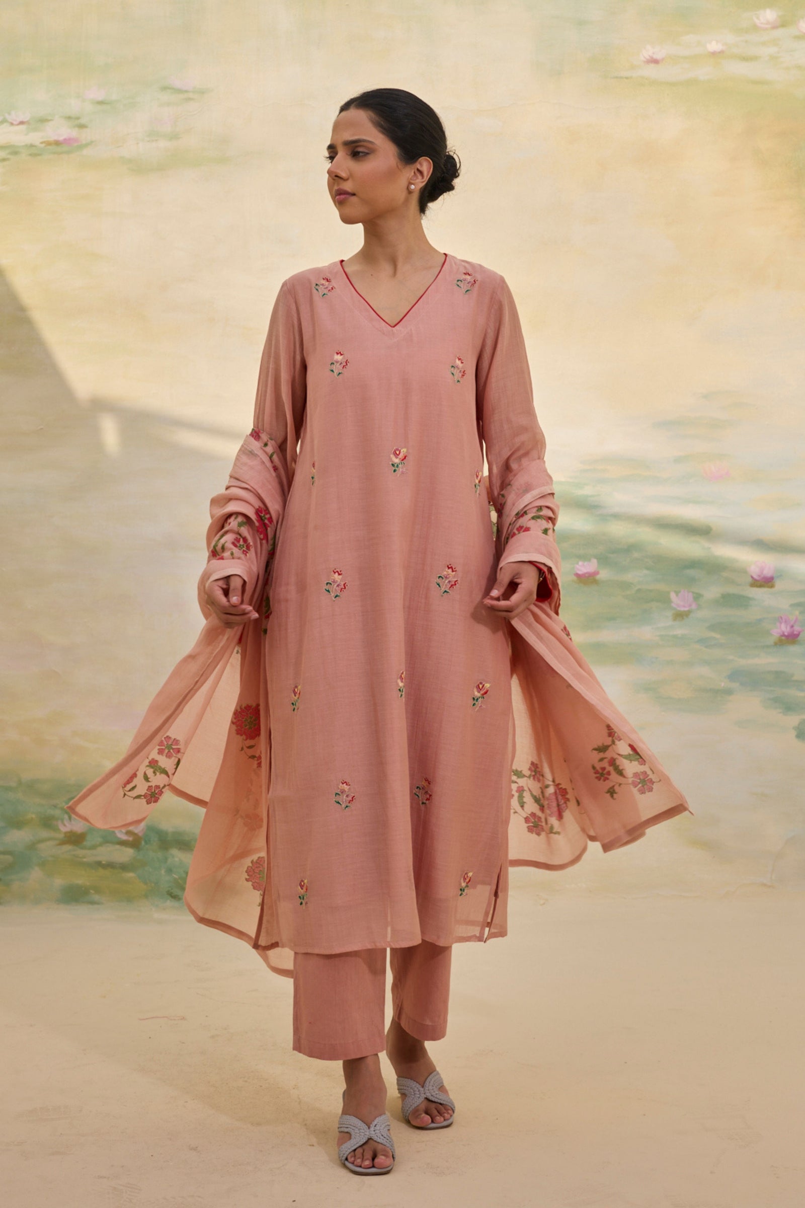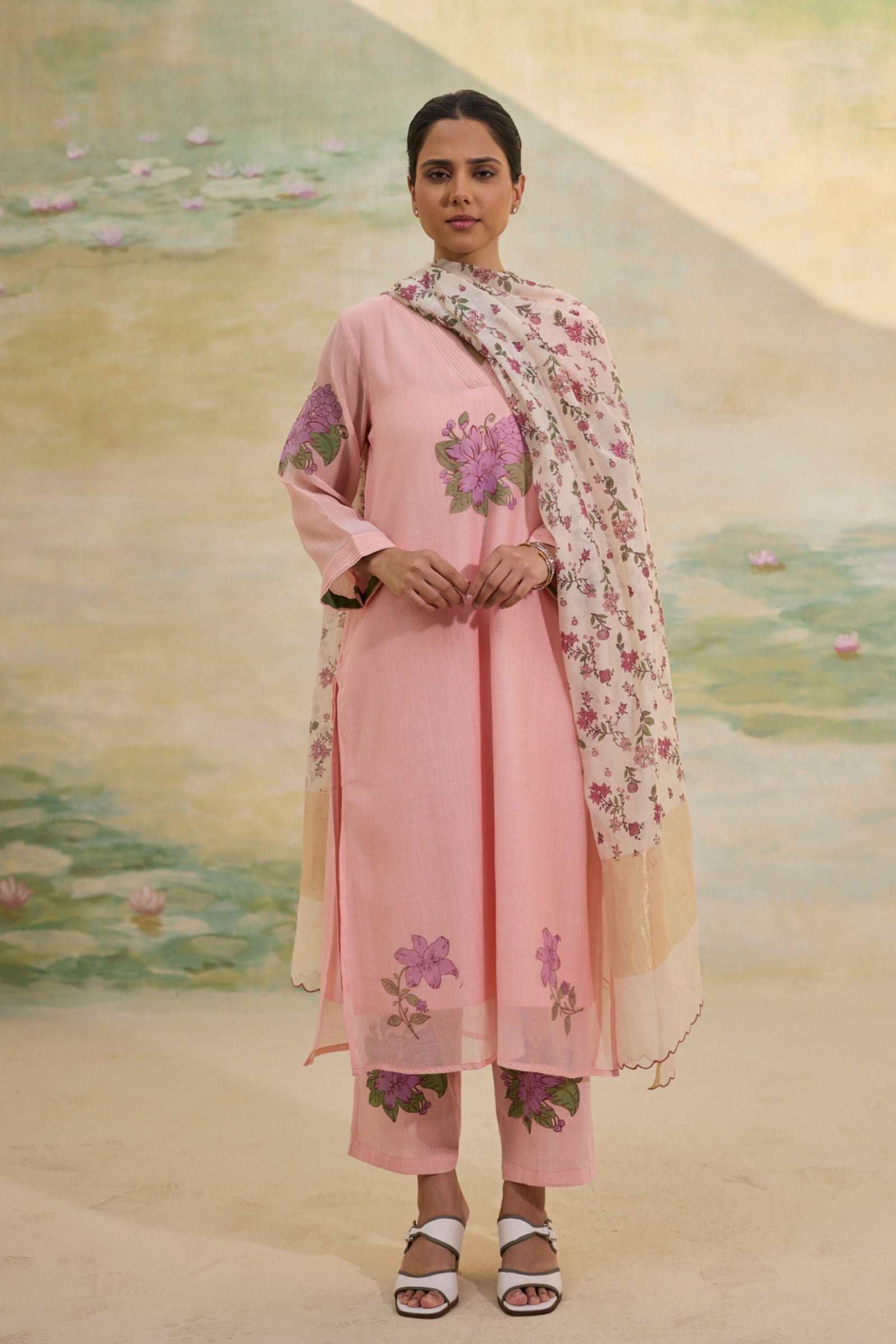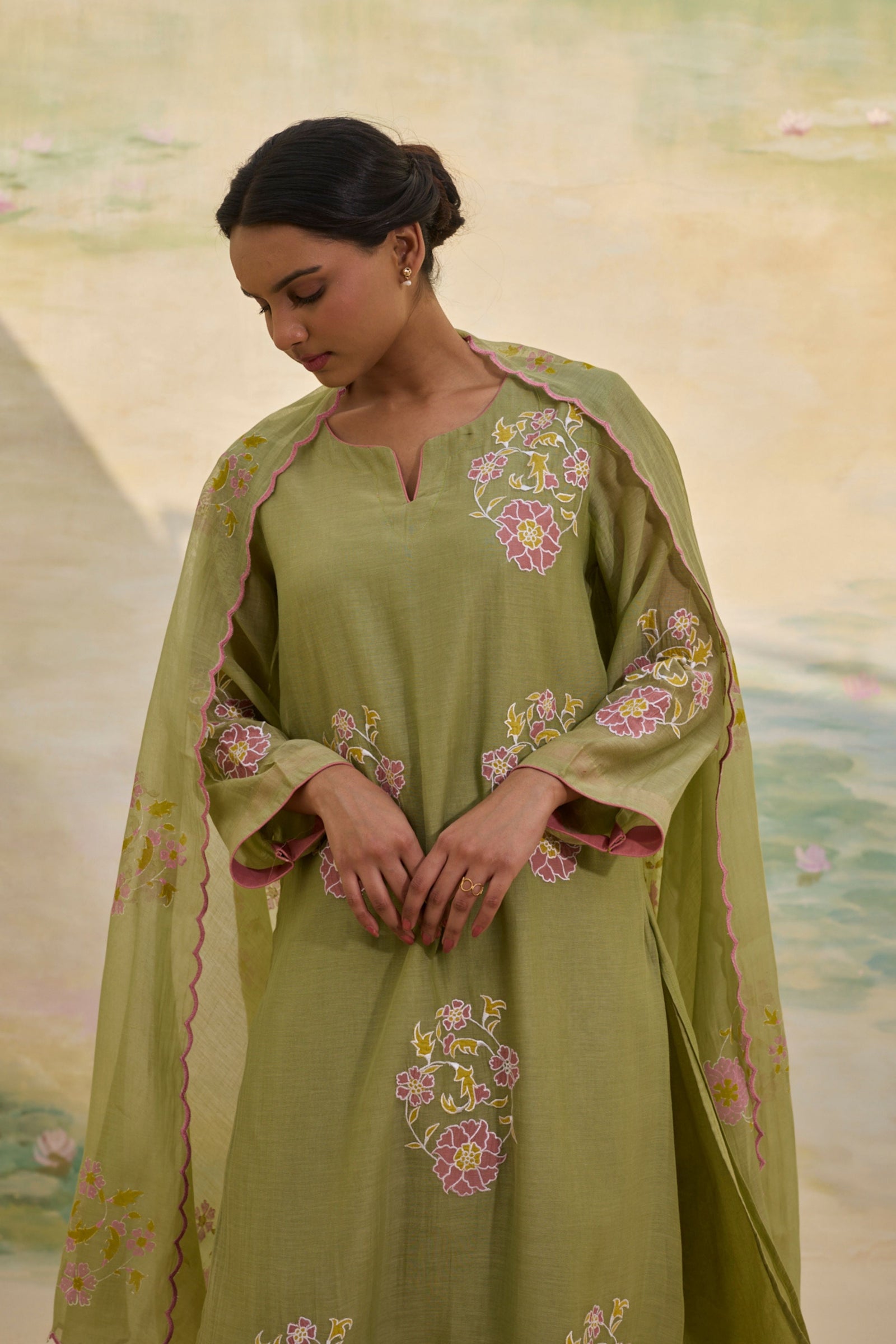• Presenting our handwoven Chanderi relaxed-fit shirt, Adorned with florette prints, soft and bright, Smocking details grace the neck and sleeves, A delicate touch, a timeless delight. Each bloom whispers of nature’s grace, While intricate smocking adds its trace, A perfect blend of art and ease, Where beauty and comfort gently tease. Note: Each piece holds its own story—slight variations in color, embroidery, or print are the soulful marks of handmade artistry.