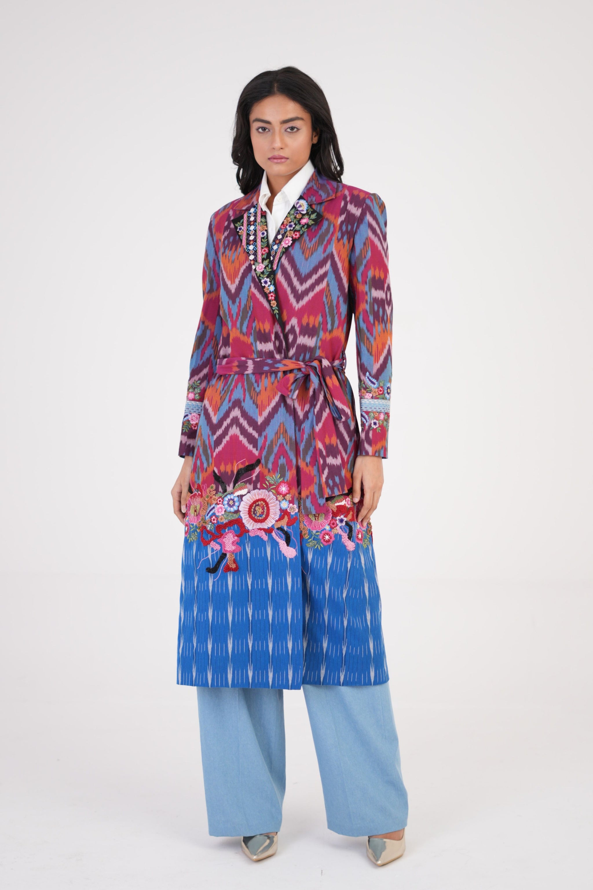 • Make a bold yet timeless statement with the printed legacy long jacket by be true, a fusion of artisanal craftsmanship and modern-day versatility. Crafted from premium ikat handloom cotton fabric, this embroidered long jacket is a celebration of traditional weaving blended with contemporary design. The classic white base enhances the intricate ikat patterns, making it a standout piece in any wardrobe. Whether styled over denims, dresses, or ethnic wear, this jacket brings effortless elegance and style. Its breathable cotton fabric makes it a perfect all-season layer, offering comfort without compromising on sophistication.