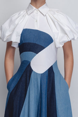 • Cut and constructed in multiple panels, this garment reflects technical precision in pattern making and construction. The lower panels are sewn in 100% Cotton Khadi Denim, while the top half is crafted in 100% Cotton Poplin, featuring a collar and a half placket opening. It is finished with raglan sleeves gathered into generous volume, creating a cloud-like silhouette that adds a sense of drama and movement. 55"
