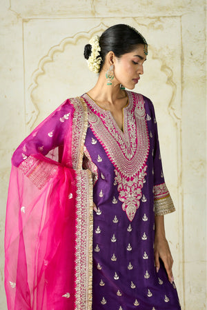 • The straight-cut kurta features intricate work along the neckline and cuffs, with scattered motifs enhancing its regal appeal. Paired with a striking contrast crinkled sharara the ensemble balances bold color play with traditional charm. The sheer matching dupatta, finished with an embellished border and delicate motifs, completes the look with grace.