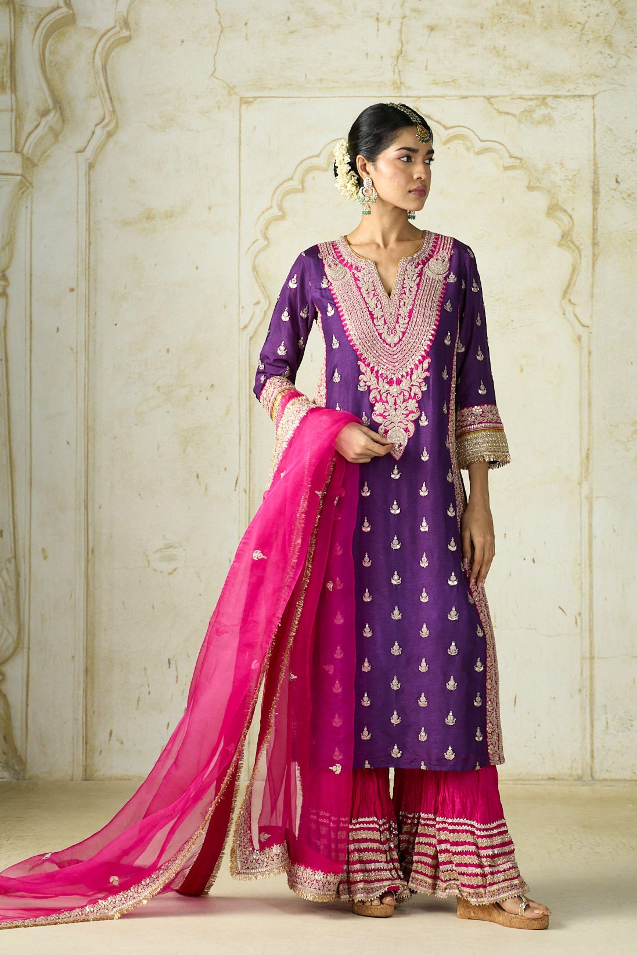 • Fabric: Kurta- Tussar, Sharara- Sami Silk, Dupatta- Organza