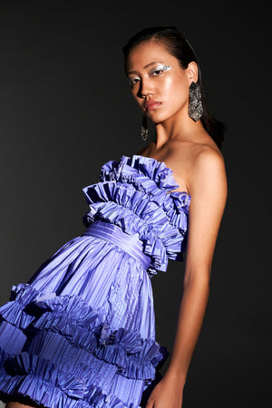 • Make a statement in dramatic ruffles with this extraordinary dress! The crushed parachute fabric in a vibrant purple hue gives it a unique texture that signals to all things plush, premium and pretty.