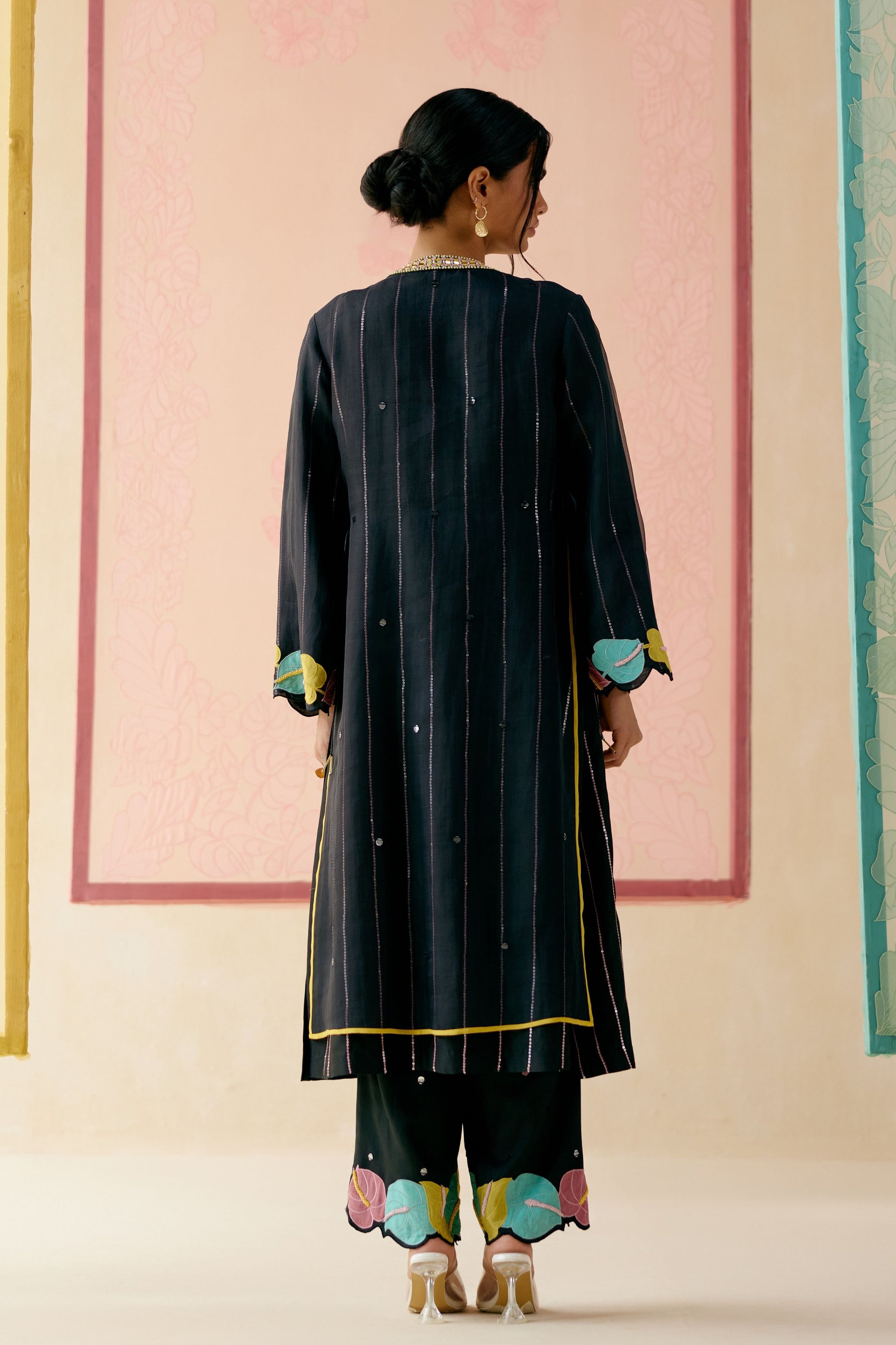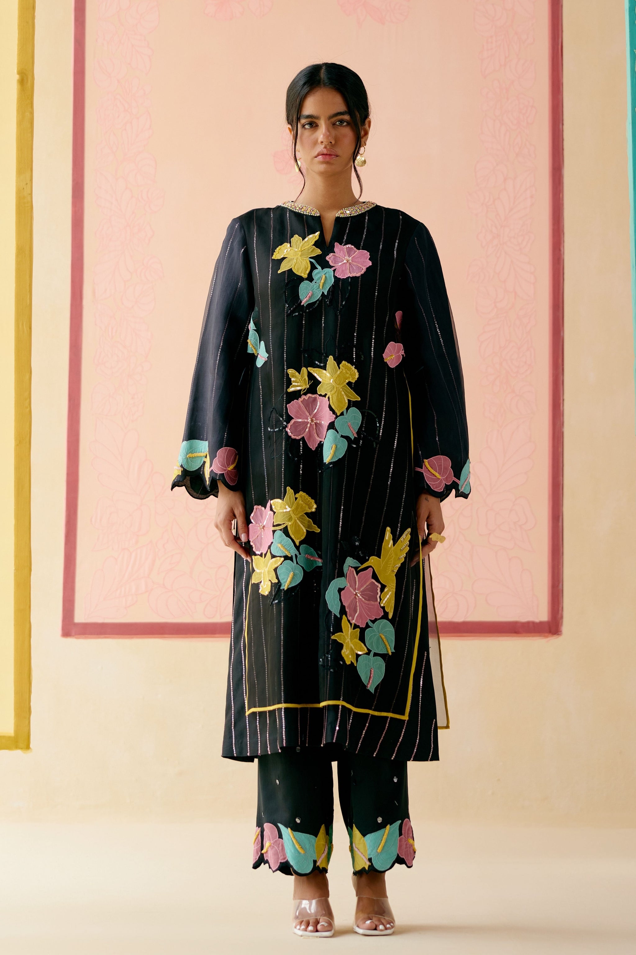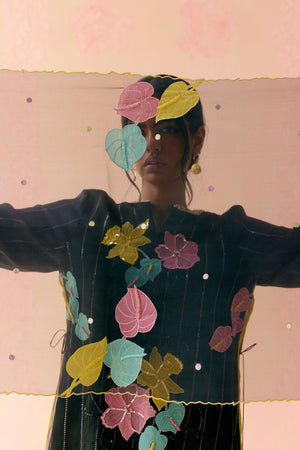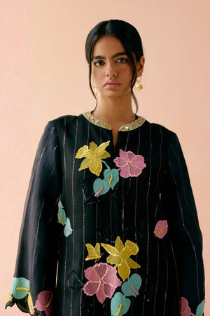 • Rainbow rose black silk organza layered kurta set crafted with delicate see through applique work of flower petals and leaves. Subtle sequins stripes in the inner layer shimmers secretly through a sheer organza outer layer of appliqued colorful petals-each one hand embroidered with sequins and cutdana, glistening like morning dew. The outer layer features adjustable side tie ups paired with half elastic appliqued pants that offers comfort without compromise and style with a soul. The ensemble is crafted to enchant and inspire, echoing the timeless elegance that blossoms with every spring.