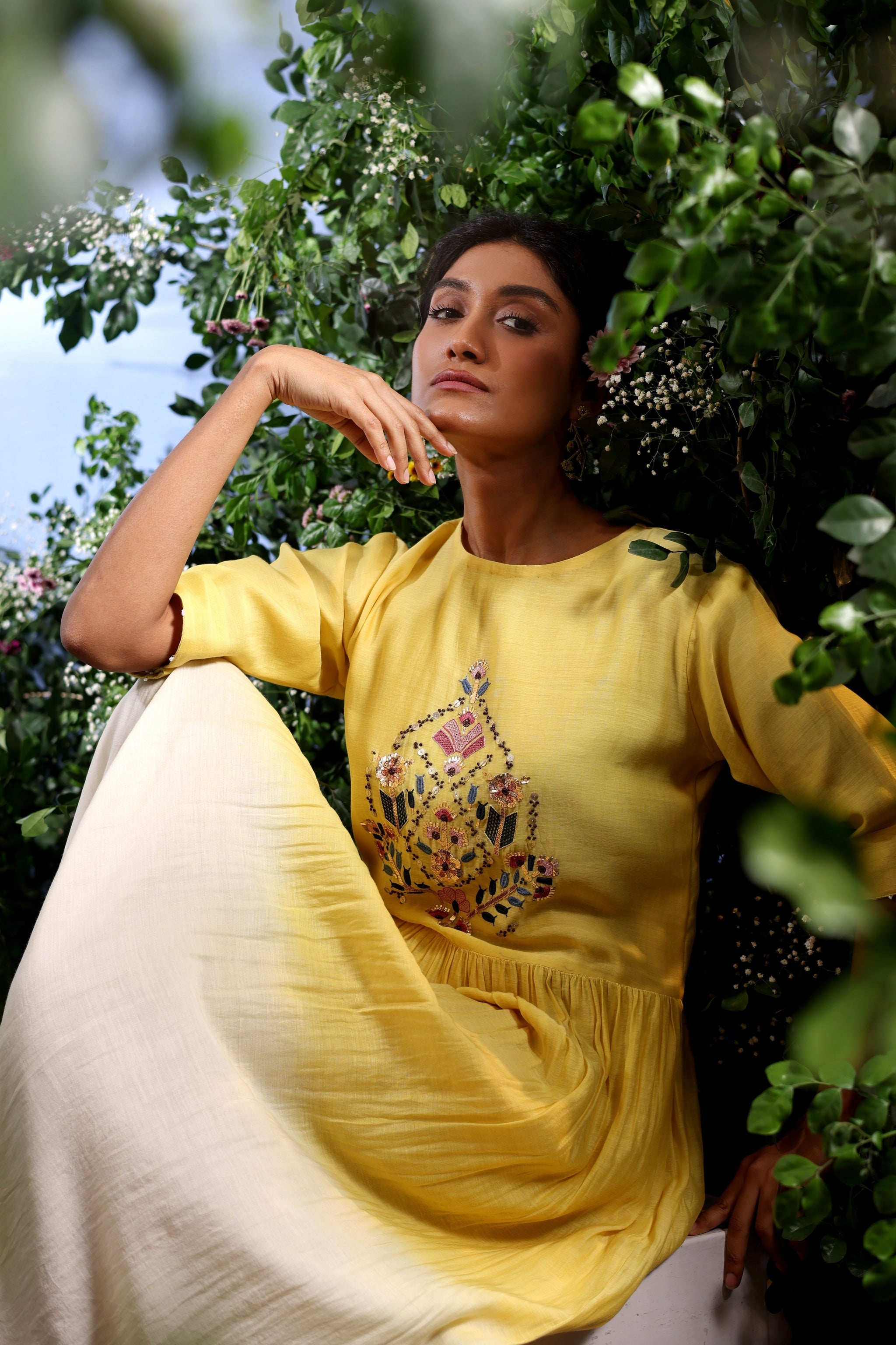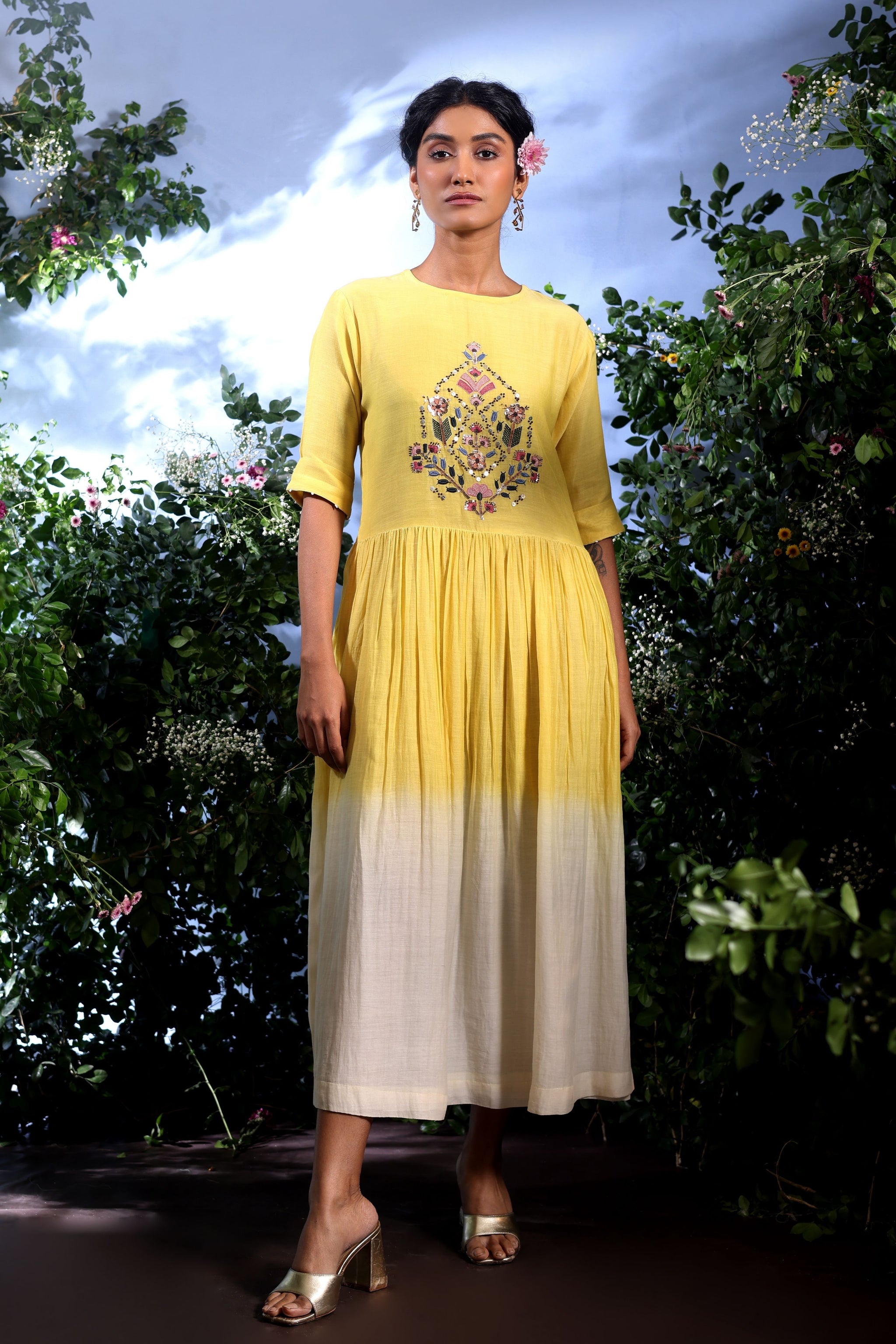 • Bask in the ease of springtime escapes with this pure Malai Chanderi long dress. The bodice features delicate hand embroidery in Mukesh and threadwork, adding a subtle shimmer, while a soft white-to-yellow ombré effect fades gracefully from bottom to top, evoking sunlit horizons. Light, airy, and effortlessly fluid, the dress captures the essence of resort living, blending artisanal craftsmanship with breezy, sun-soaked elegance.