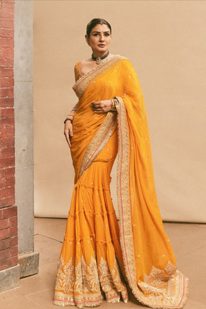 • The saree features an intricately embroidered border. The gracefully pleated drape flows into a richly adorned hemline adding grandeur to the ensemble. Paired with a matching full-sleeved blouse showcasing all-over embroidery this saree strikes the perfect balance between traditional artistry and contemporary elegance.