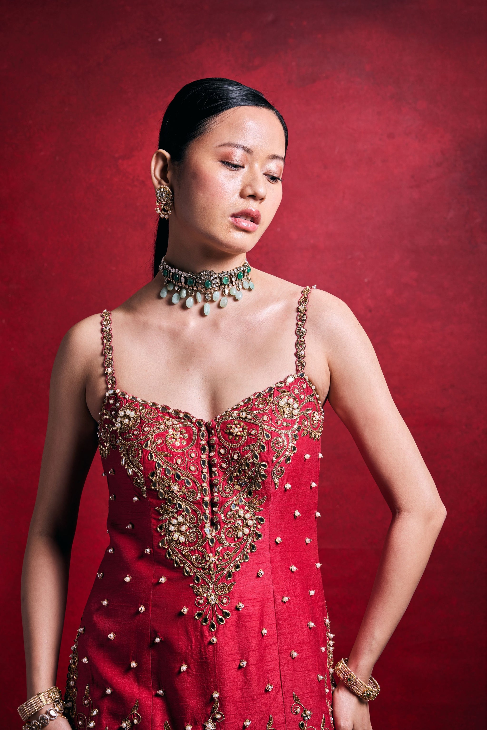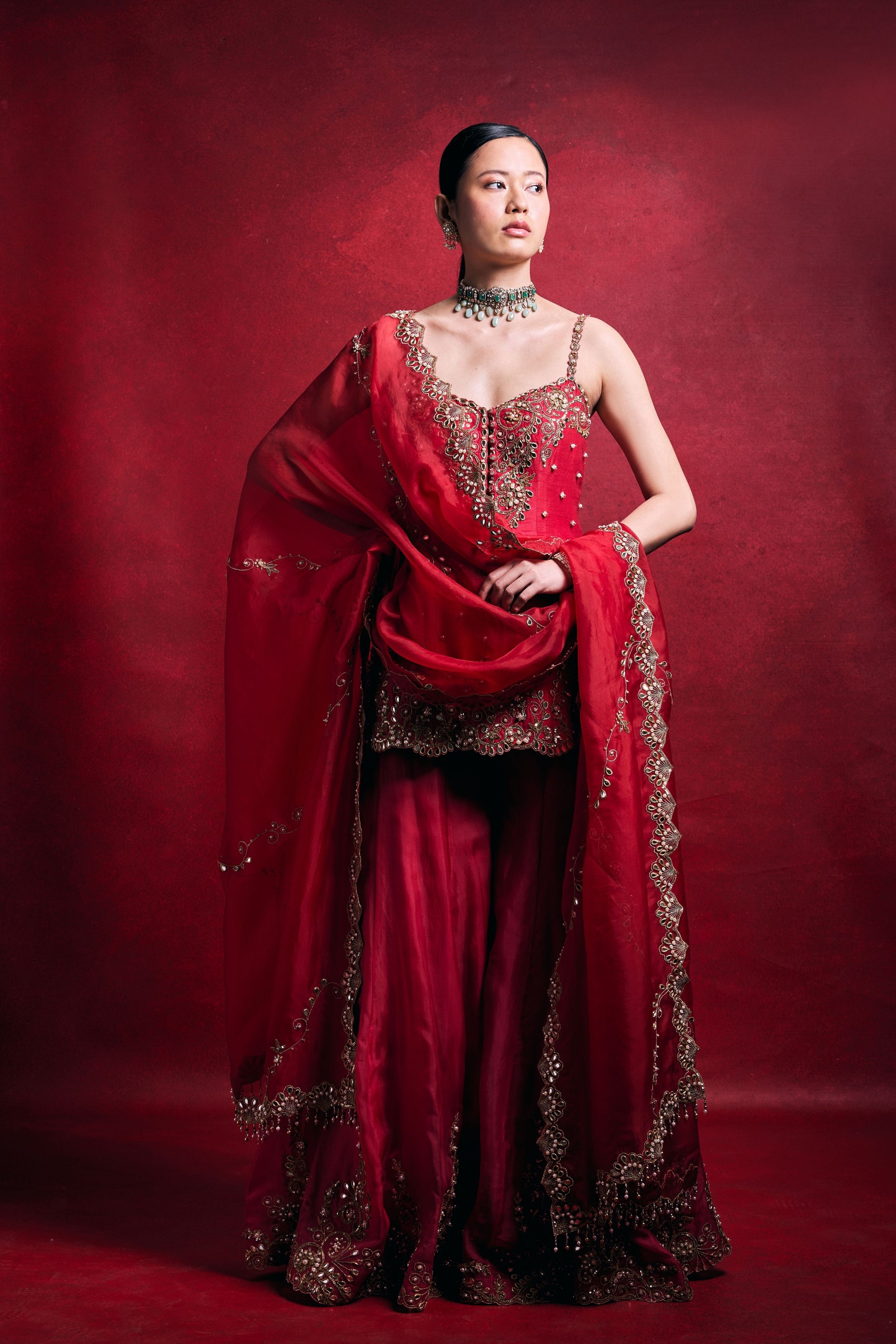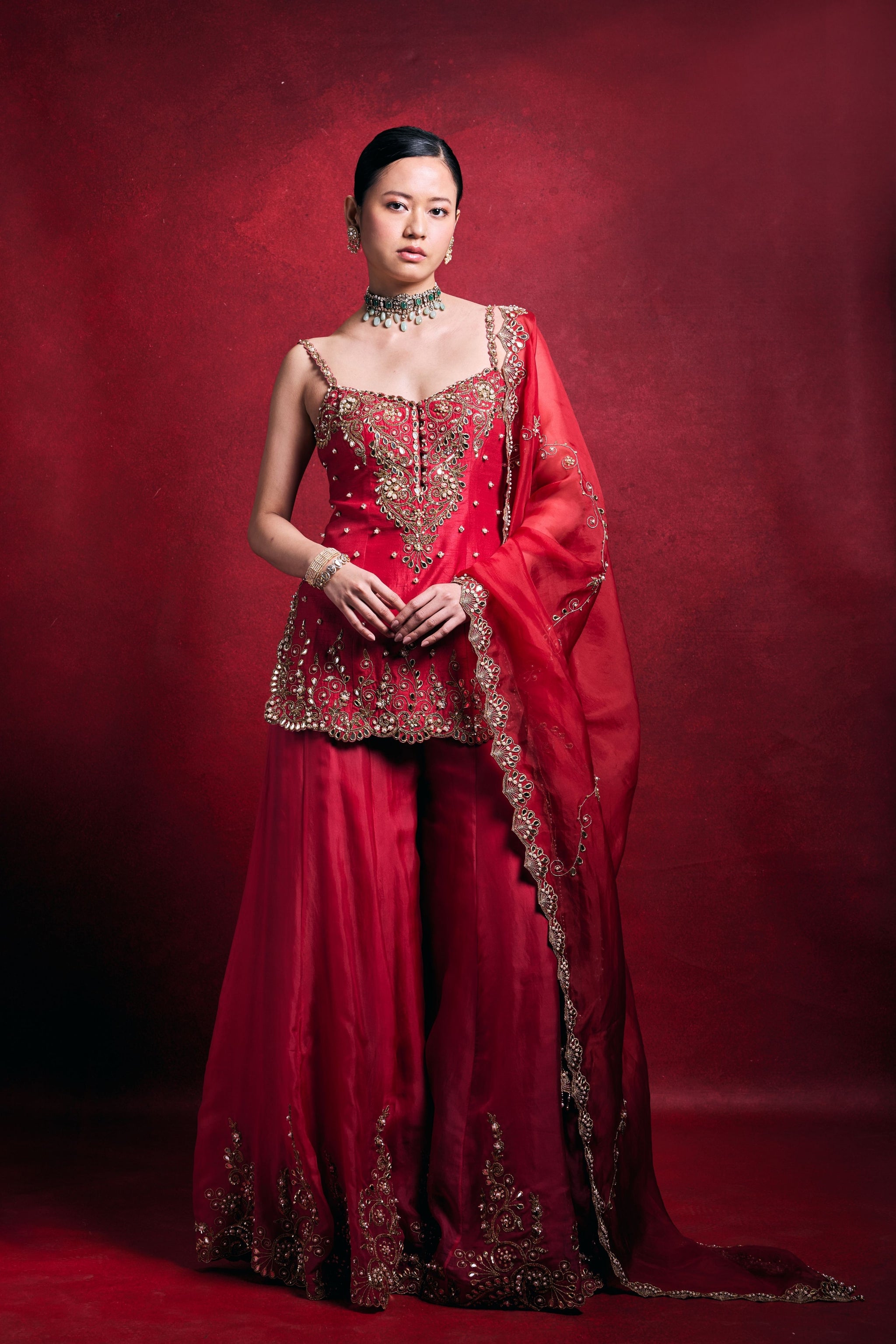 • This elegant ensemble features a red raw silk kurta and sharara paired with a delicate pink organza dupatta. Adorned with intricate dori, mirror, pearl, sequin, zari, patra, and poth embroidery, it exudes timeless festive charm with a refined, regal appeal.