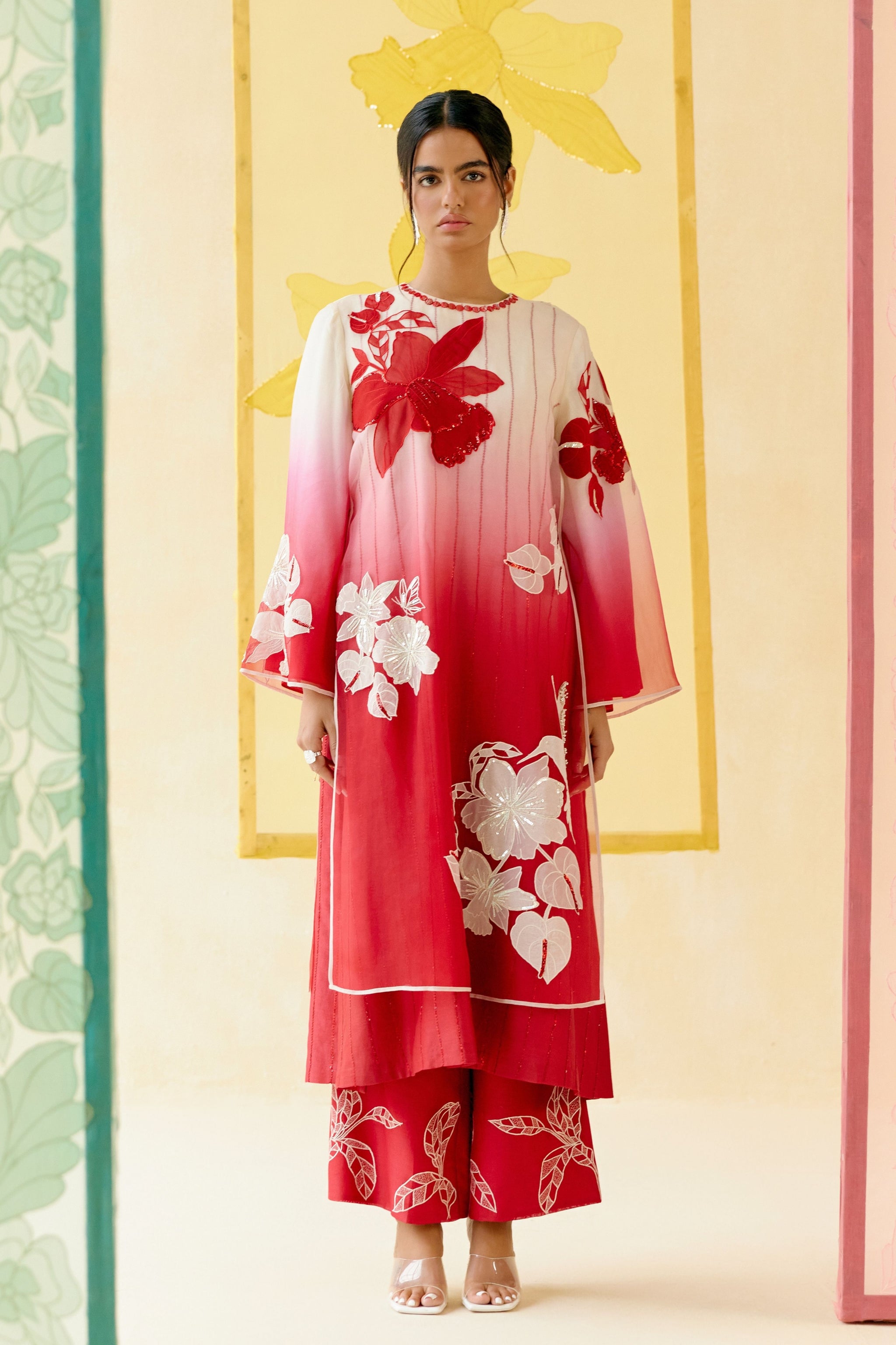 • Red and white rose silk organza layered ombre kurta set crafted with delicate see through applique work of flower petals and leaves. Subtle sequins stripes in the inner layer shimmers secretly through a sheer organza outer layer of appliqued petals-each one hand embroidered with sequins and cutdana, glistening like morning dew. The outer layer features adjustable side tie ups paired with half elastic appliqued pants that offers comfort without compromise and style with a soul. The ensemble is crafted to enchant and inspire, echoing the timeless elegance that blossoms with every spring.