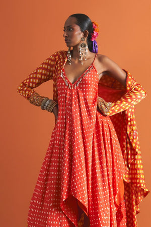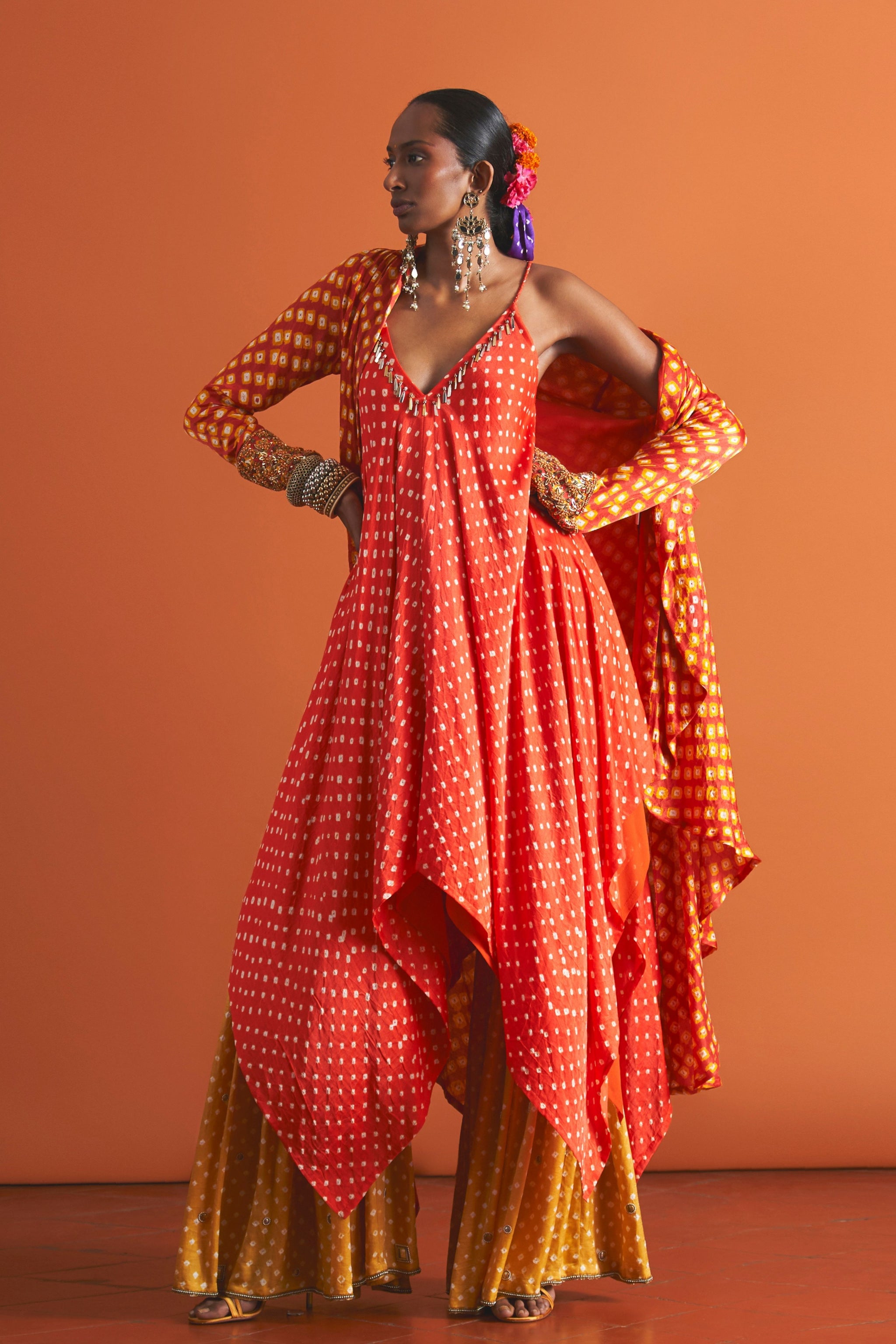 • This outfit features a red and yellow waterfall jacket, a burnt orange handkerchief kurta, and a mustard gharara.