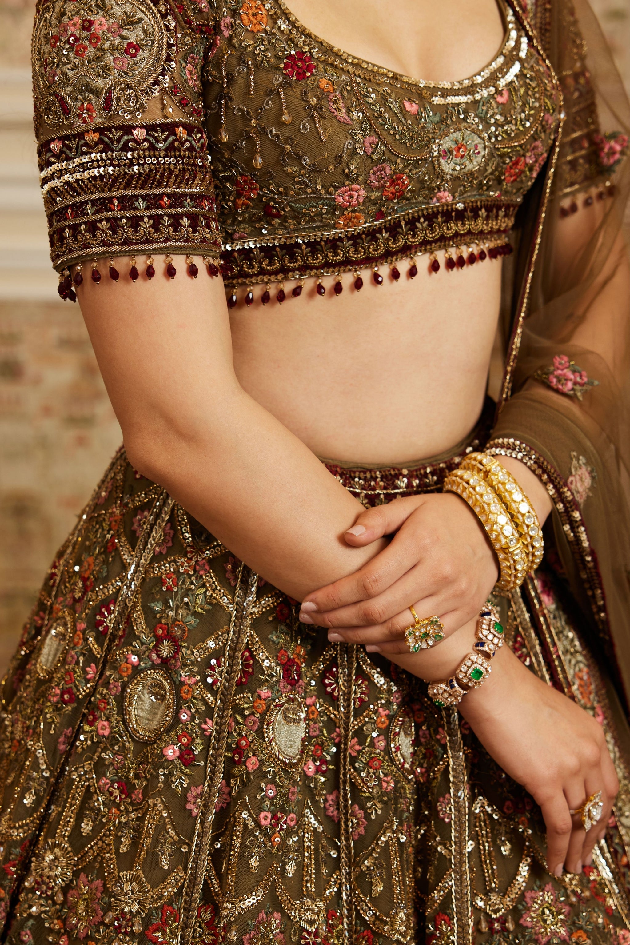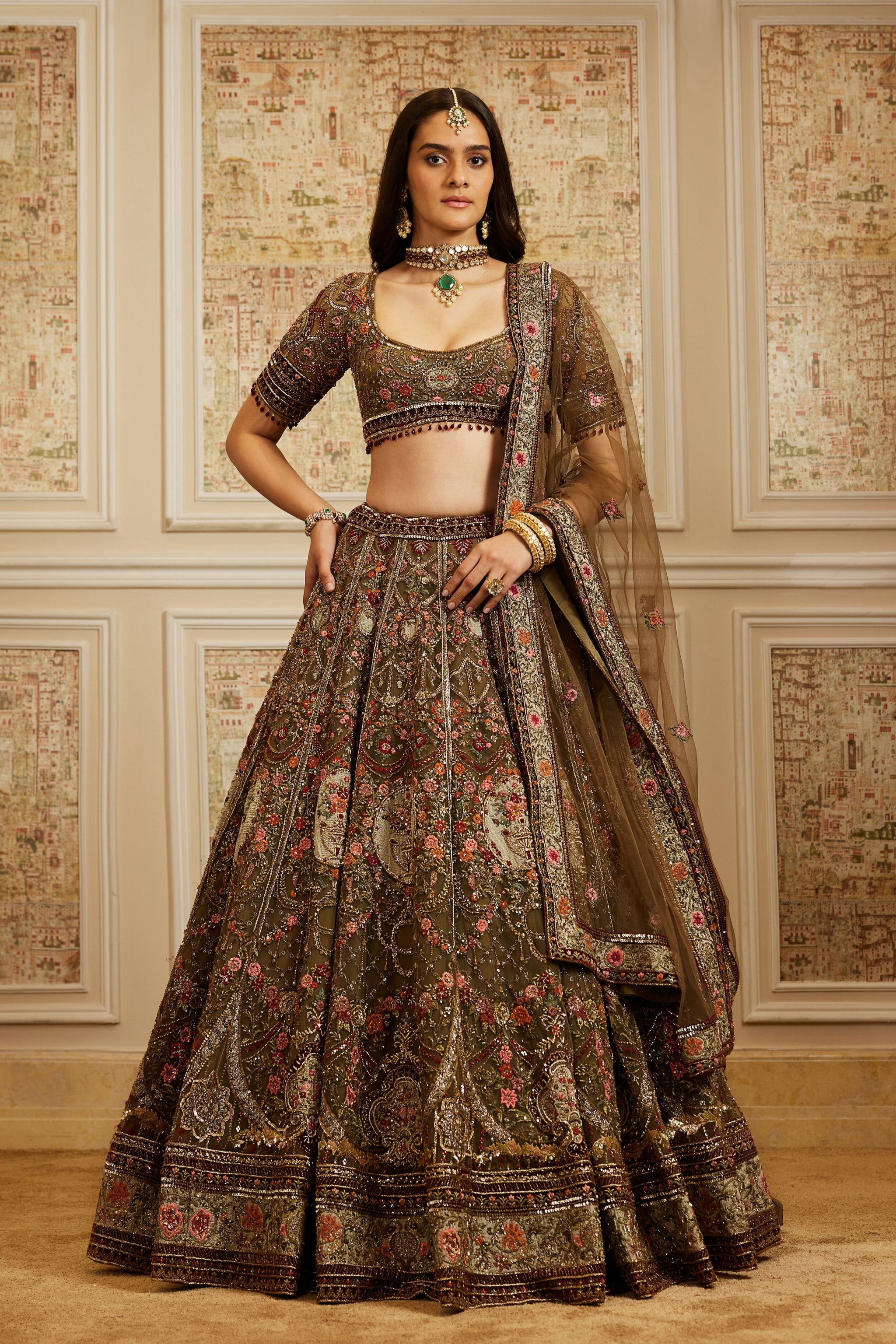 • Exude regal charm in this intricately handcrafted lehenga set, designed to make a timeless statement. The ensemble features a rich olive-brown base adorned with exquisite zari, resham, and sequin embroidery, highlighted with delicate floral motifs in shades of crimson and gold. The blouse is styled with a flattering neckline and half sleeves, perfectly complementing the voluminous lehenga skirt that flows gracefully with every step. A sheer embroidered dupatta with ornate borders completes the look, adding elegance and sophistication.