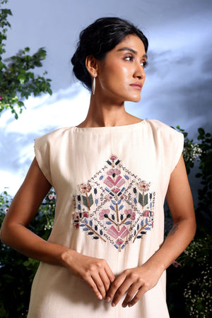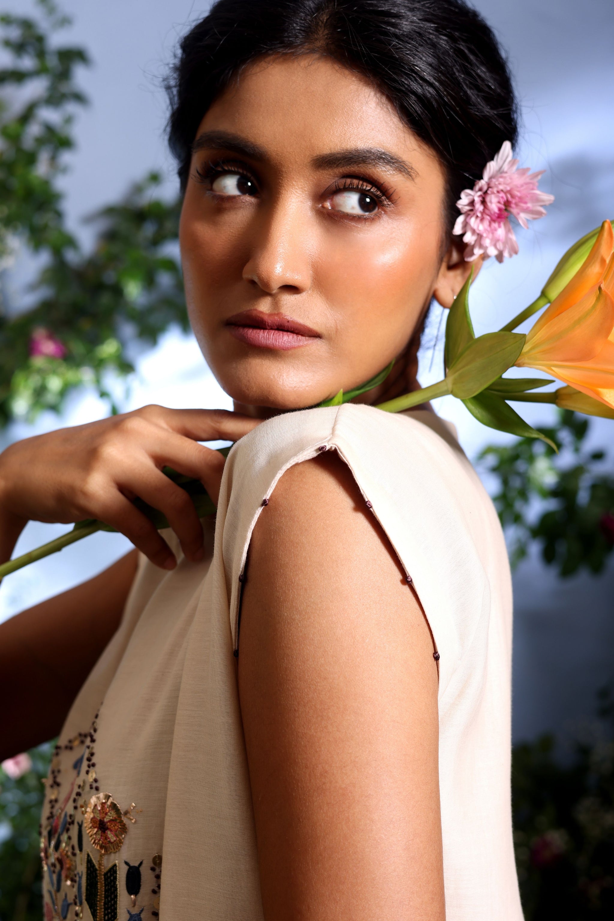 • Pure Malai Chanderi jumpsuit featuring intricate hand embroidery on the bodice with Mukesh and threadwork, and delicate hand-knotted detailing on the sleeve hems. Relaxed, breezy, and perfect for spring-summer lounging.