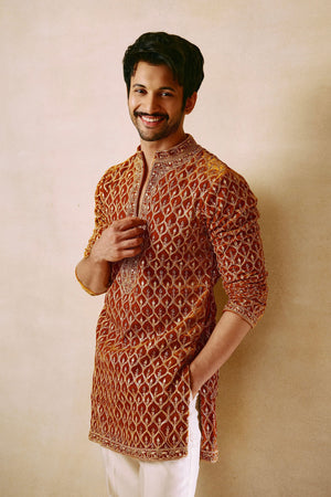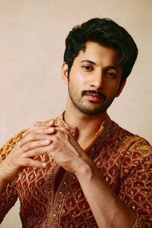 Description: Sarso Velvet Kurta Embroidered All over With Marodi work Paired With Ivory Pants.
