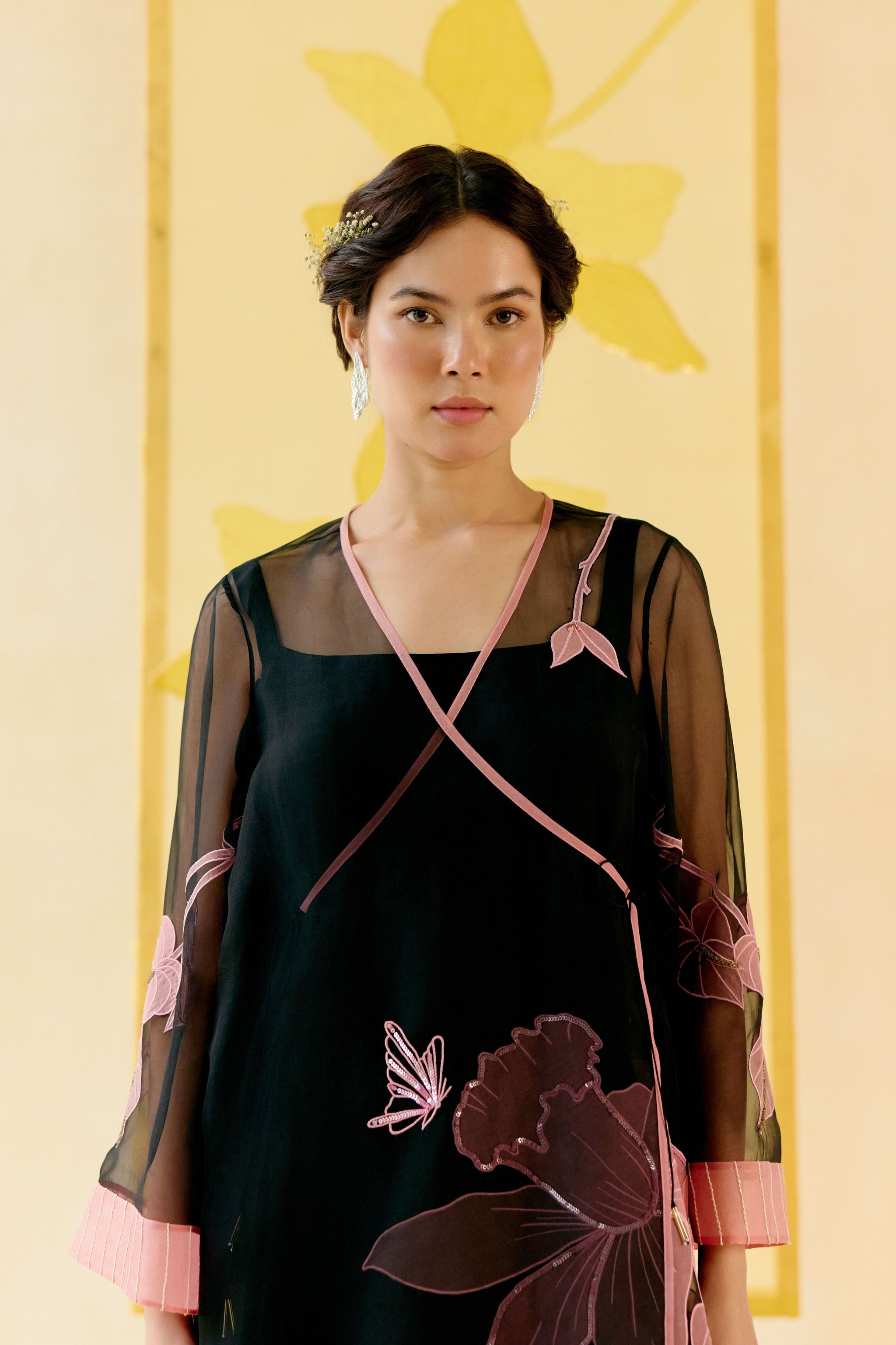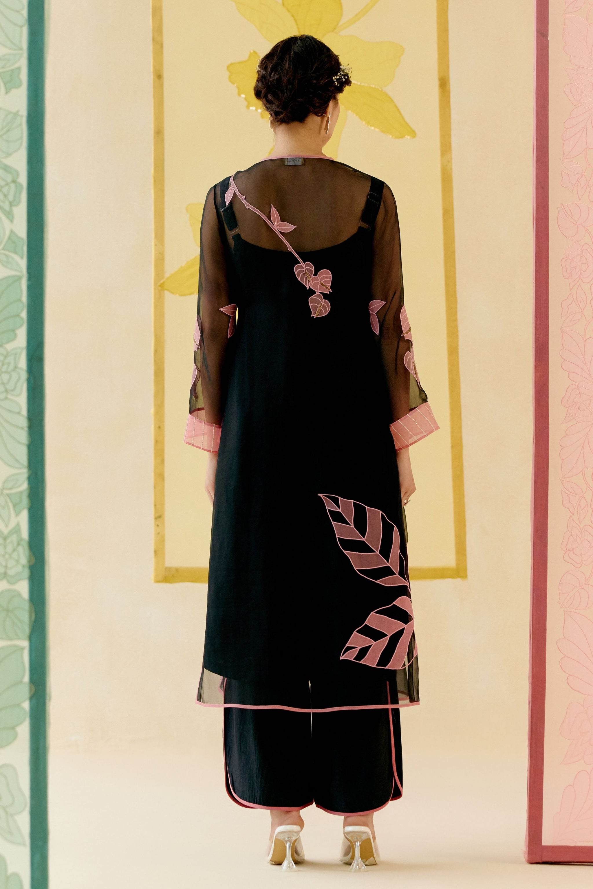 • Rose black silk organza angrakha kurta set crafted with delicate see through applique work of flower petals and leaves. The petals shines with hand embroidered sequins and cutdana, sparkling like morning dew drops. It comes with an adjustable slip and half elastic petal pants that offers comfort without compromise and style with soul. The ensemble is crafted to enchant and inspire, reflecting the timeless elegance that blossoms with every spring.