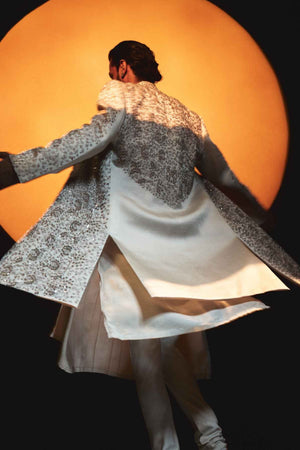 • Presenting our sherwani set in the ethereal rose crème hue, intricately hand-embroidered using traditional aari and zardozi techniques. Adorned with sequins, stones, zari, and dabka, it creates a richly textured surface. Hidden within the delicate ivy of flowers lies the divine trishul—a symbol of cosmic power and the trinity of creation, preservation, and destruction. Paired with an anarkali kurta and churidar, this sherwani is a celebration of craftsmanship, divinity, and timeless elegance.