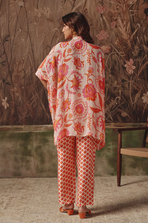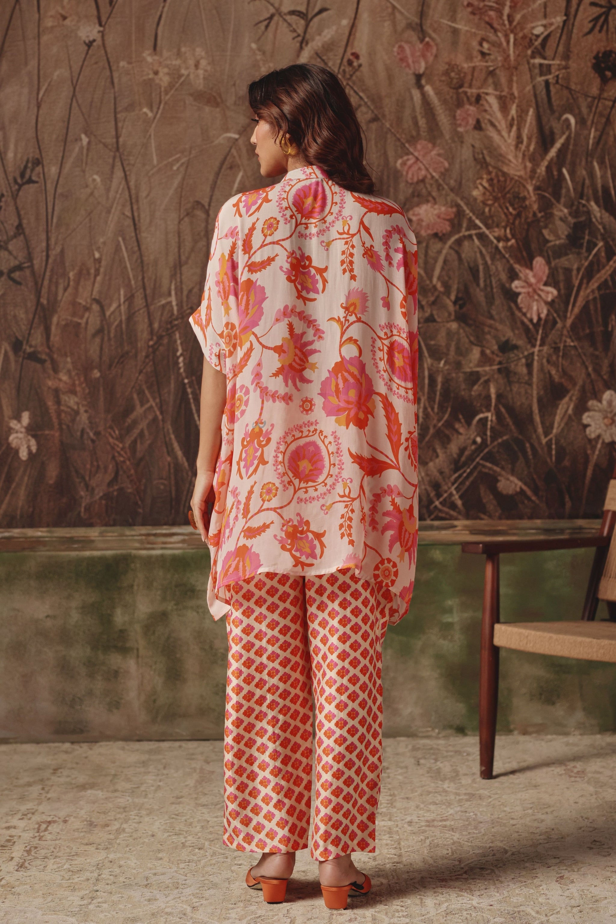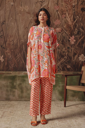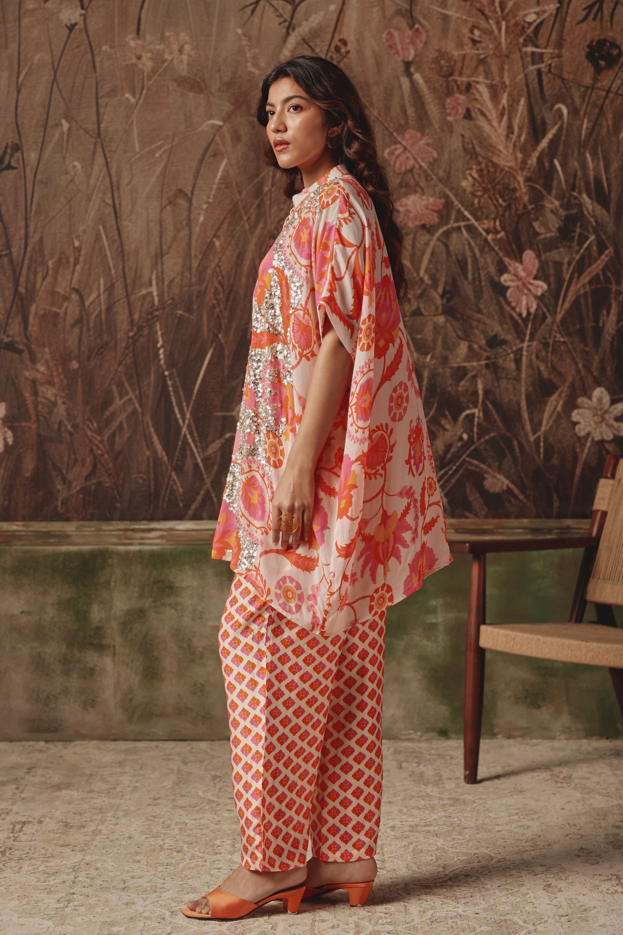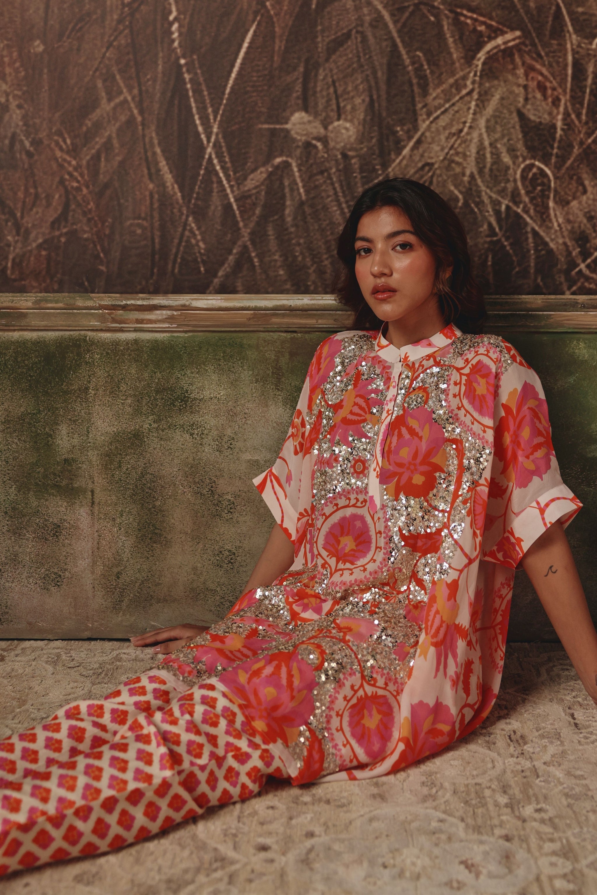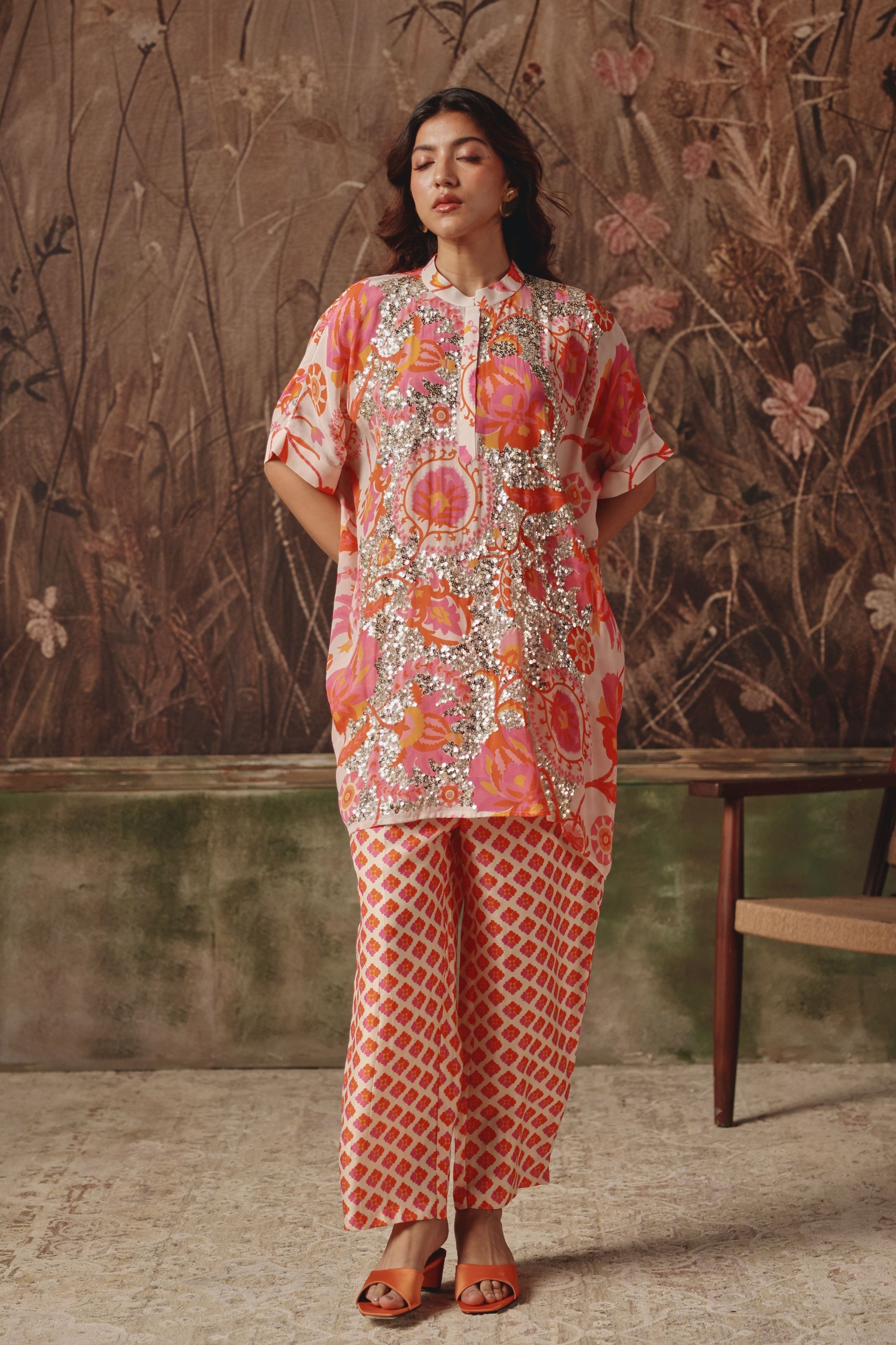 • A peach-and-pink co-ord set that evokes the look of ancient floral mosaics. The sequinned surface sparkles with gentle luminosity, while the silhouette remains breezy and modern. Paired with geometric printed trousers, it brings together craft, colour, and artistry in an effortlessly wearable form.