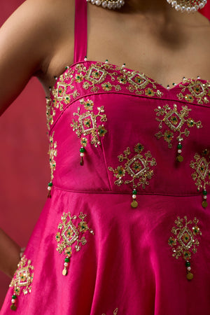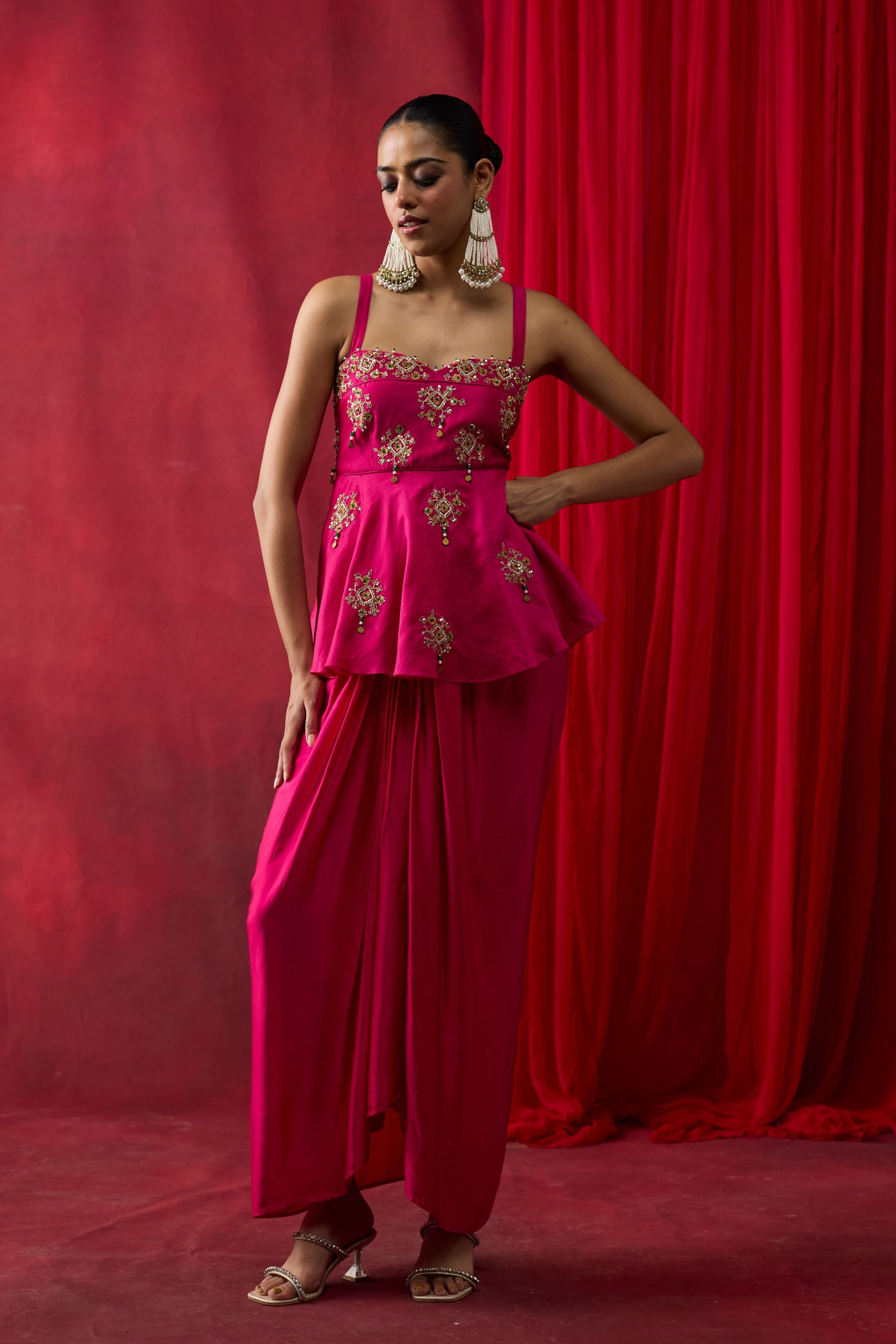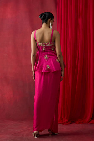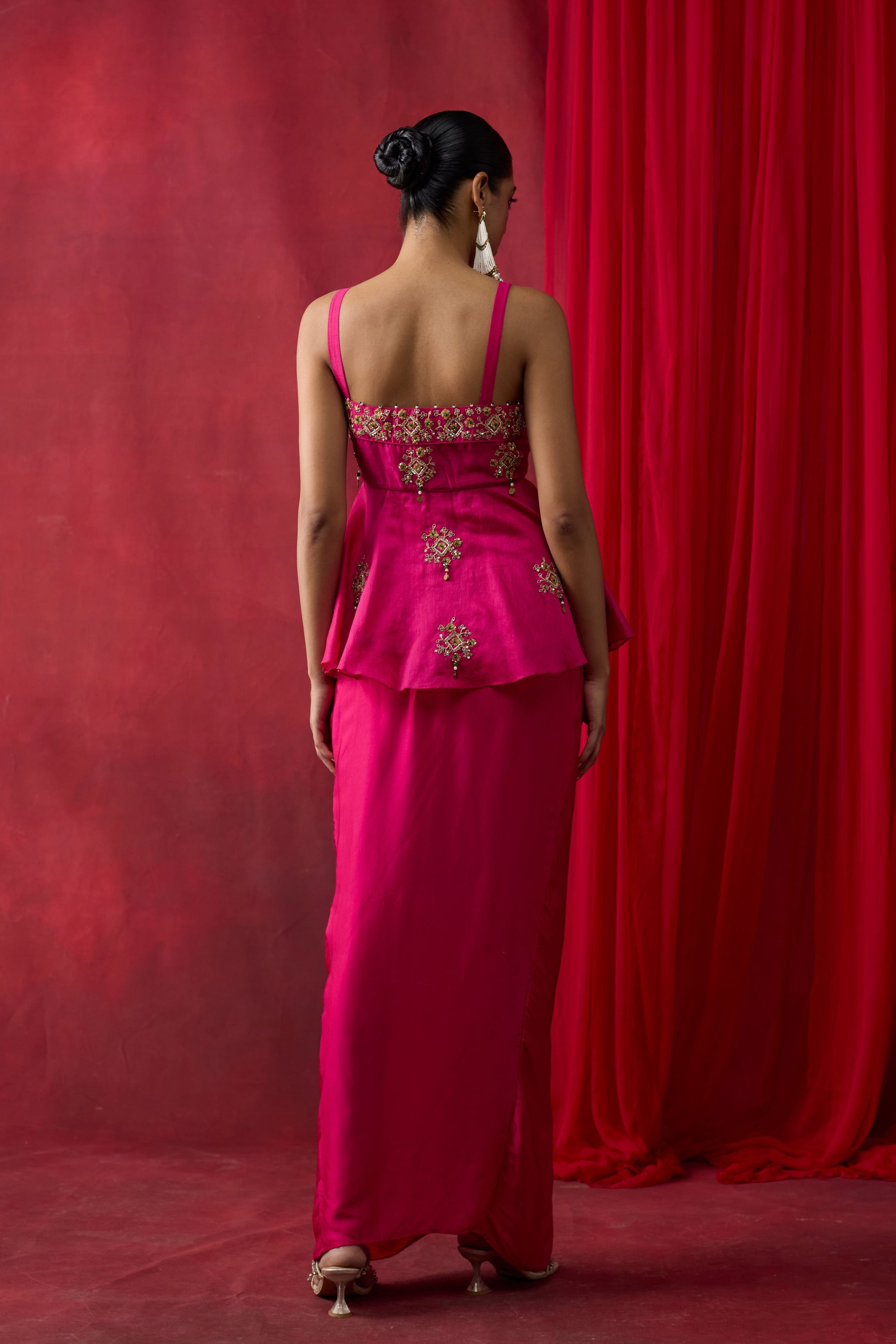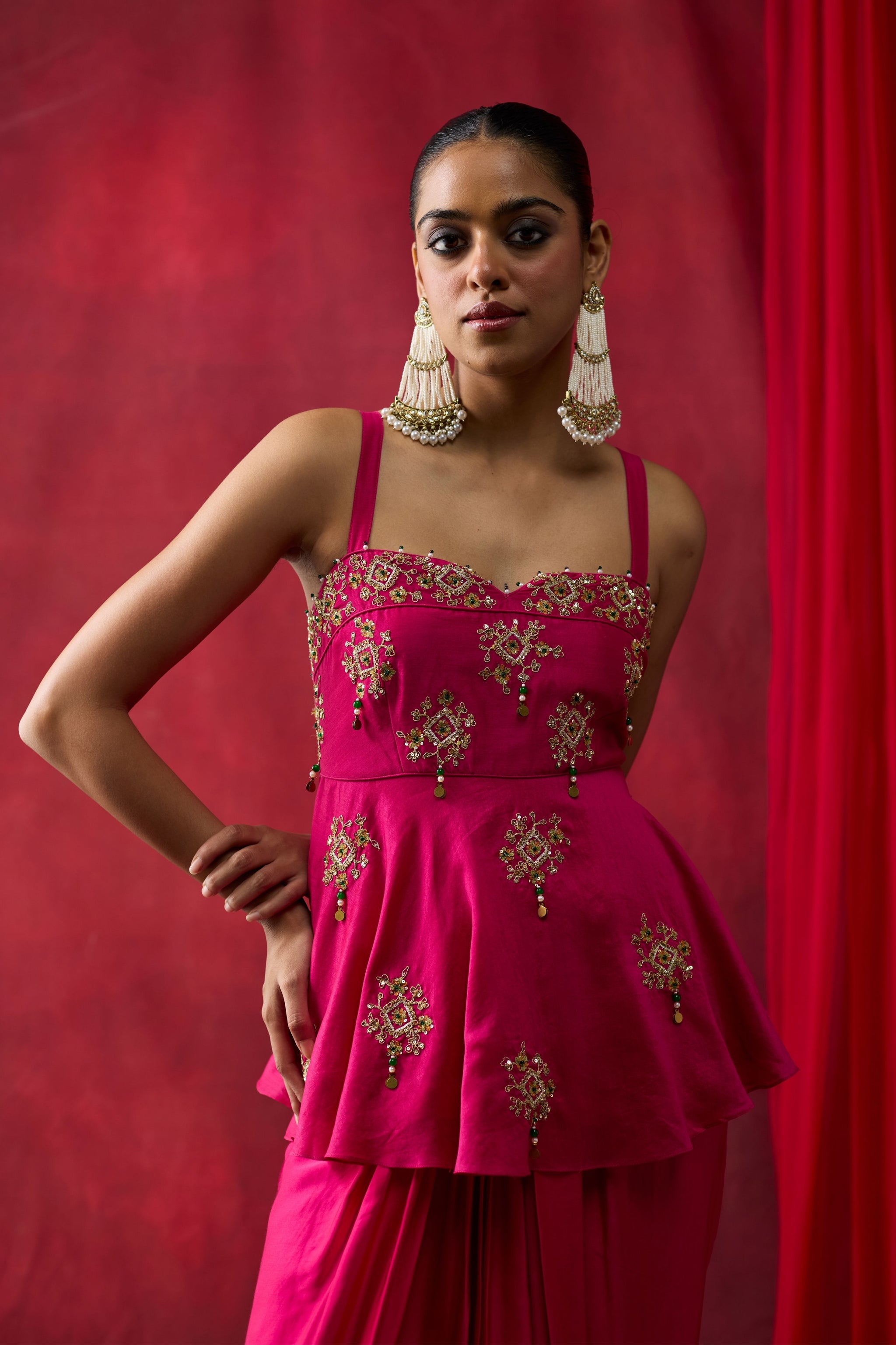• Pink thread and hand-embroidered silk chanderi peplum top, paired with a silk satin draped skirt.