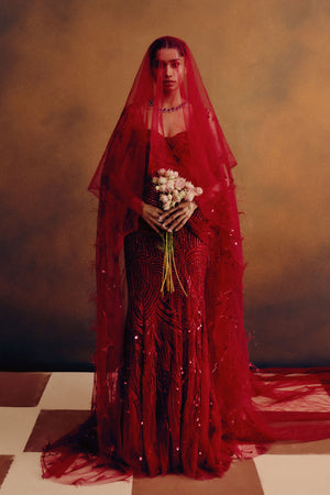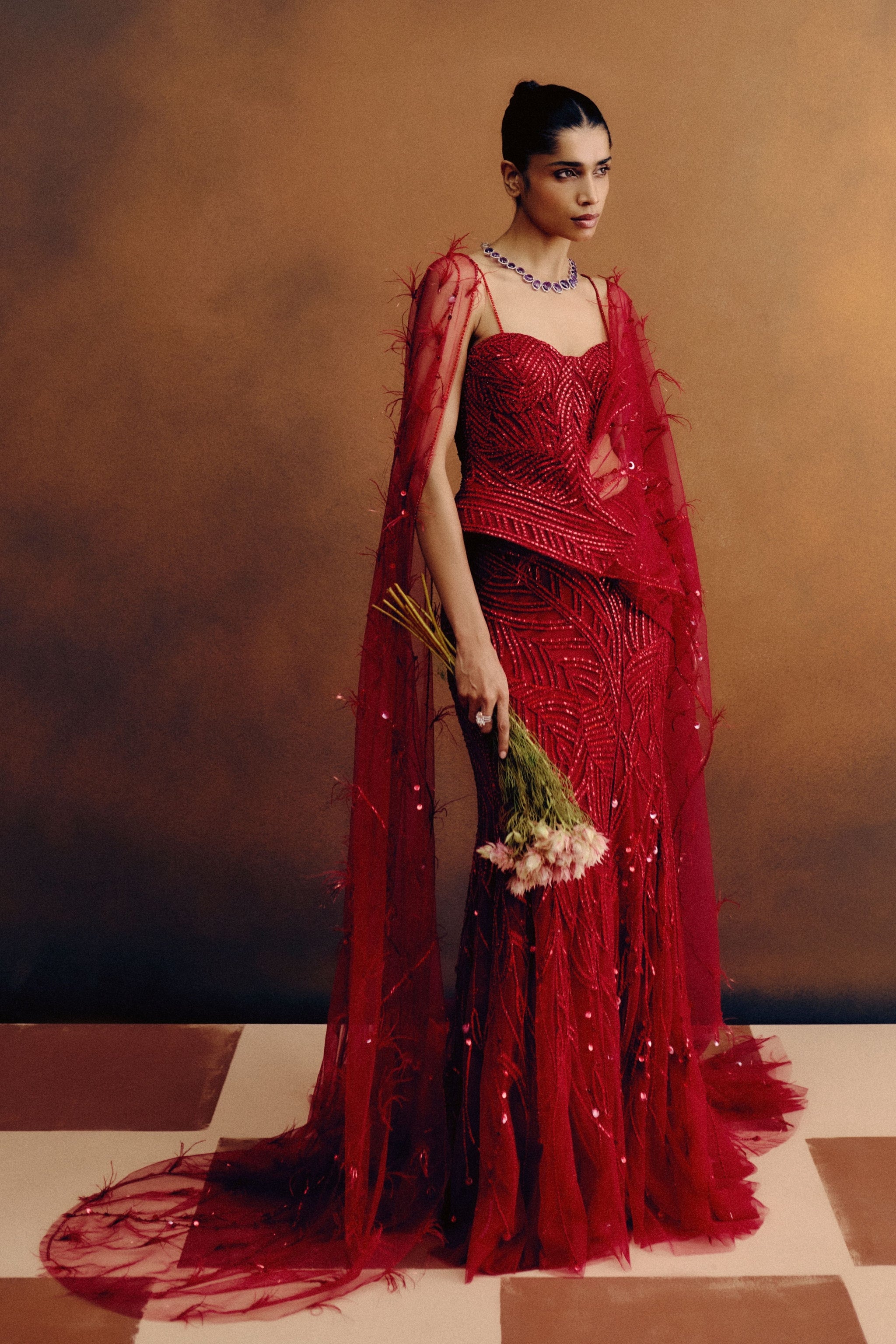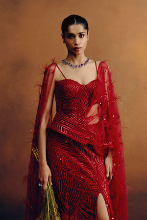 • Drenched in a profound shade of deep red, this corset and skirt set is adorned with monochromatic hand embroidery that whispers luxury in every stitch. A feather-accented dupatta drape cascades with theatrical grace, its artistry heightened by meticulous handwork and jewel-like detailing.