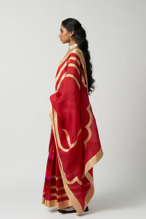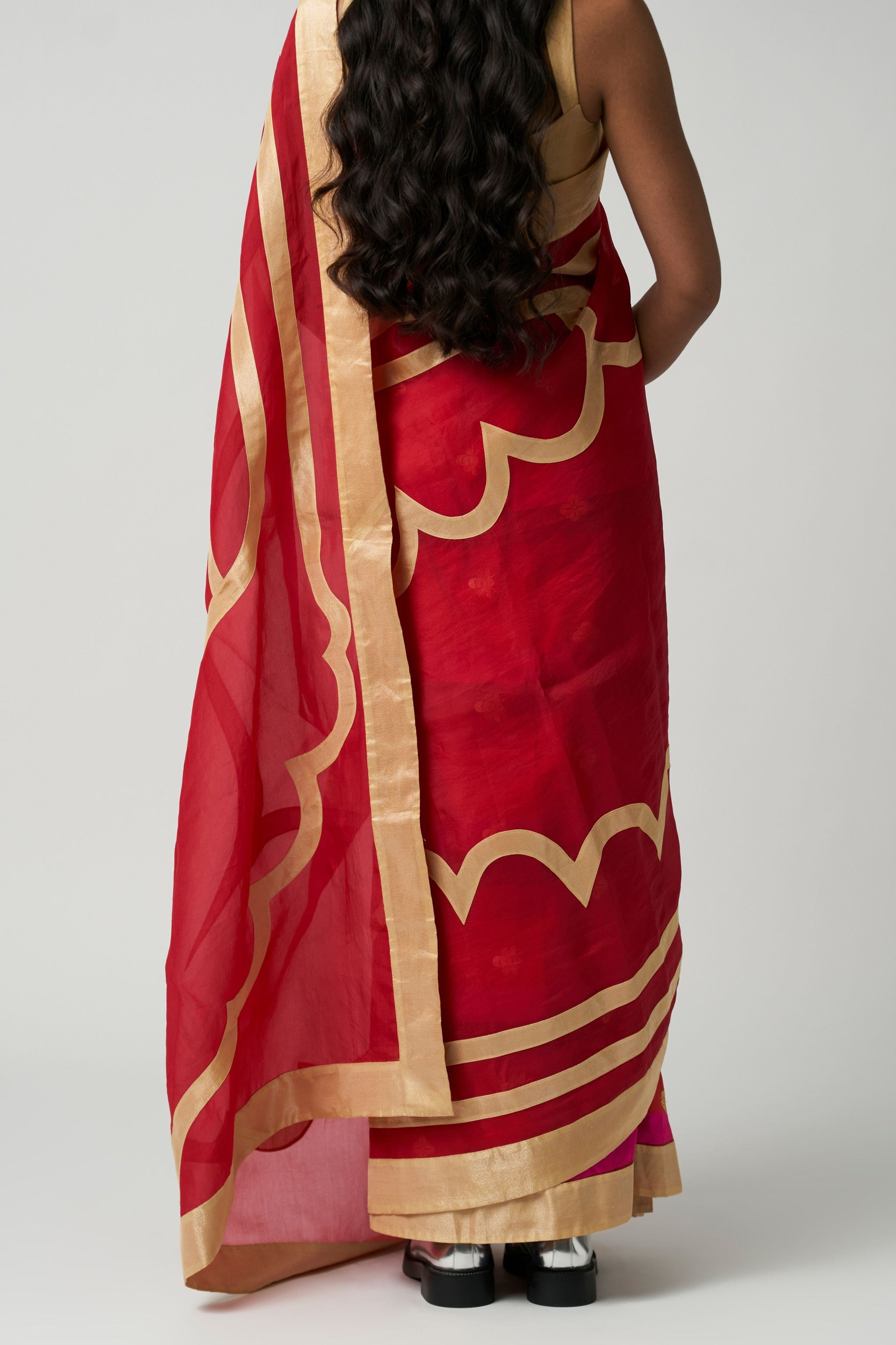 • A signature ohfab creation, this half-and-half saree combines the richness of handwoven pachranga silk with the delicacy of organza. The silk drape is adorned with intricate woven booties, a hallmark of ohfab’s craftsmanship. While the organza pallu features fine tissue appliqué in the shape of mughal arches. This unique fusion of color, texture, and architecture makes the saree a statement piece for weddings, festive occasions, and luxury celebrations. Length 5.5 metre x width: 44"