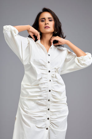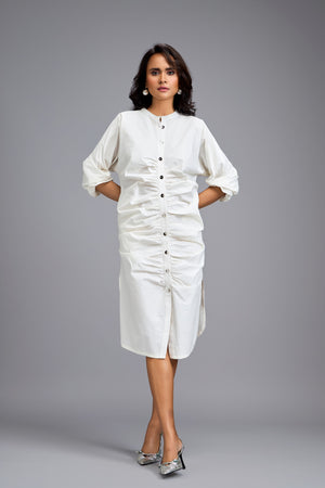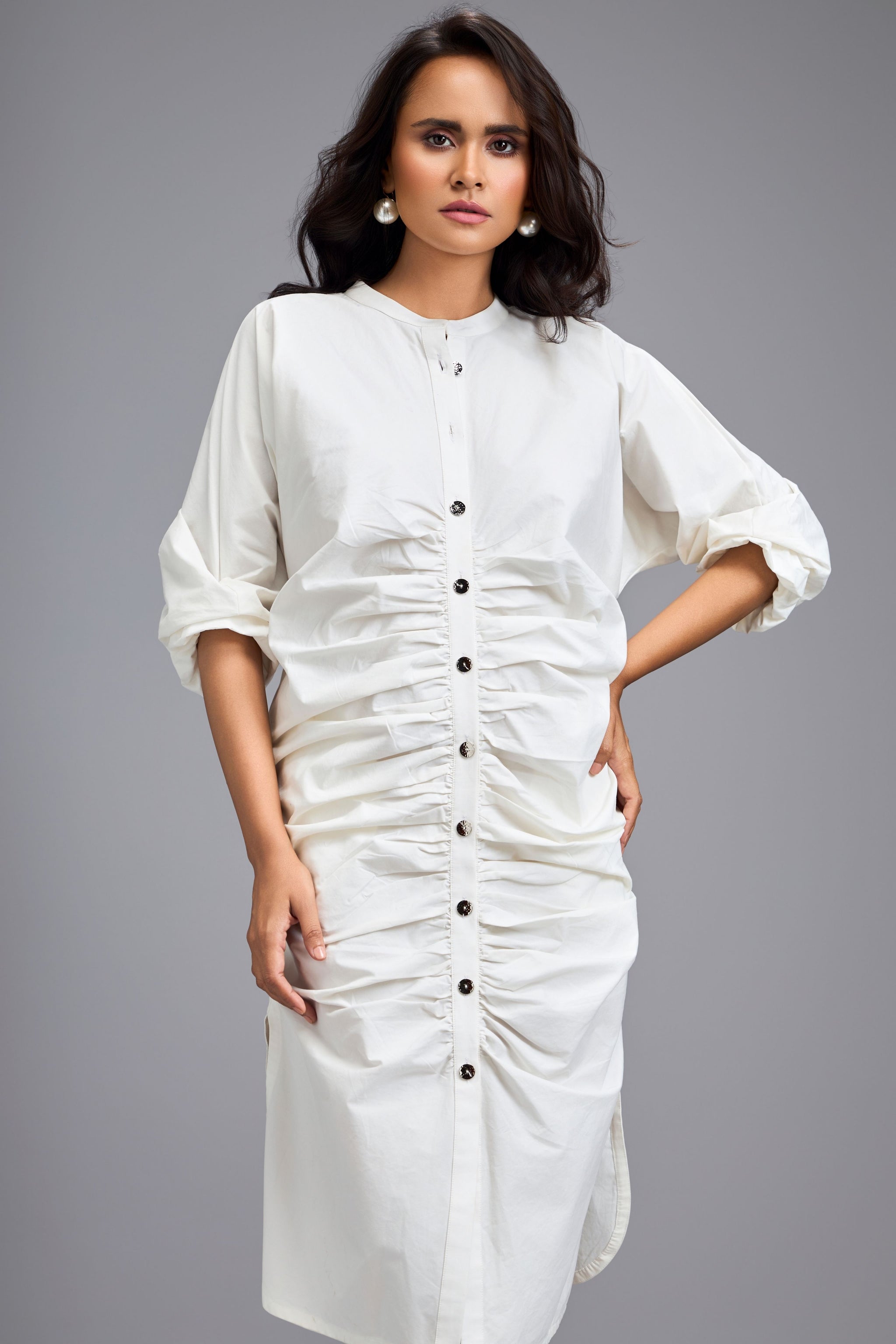 • White shirt dress with button-down front, featuring ruched detailing along the center and rolled-up sleeves