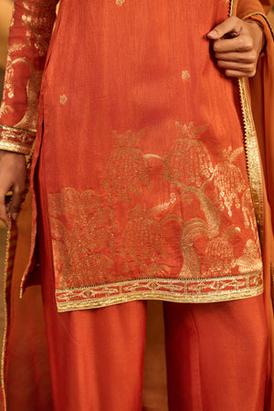 • Kurta- beautiful jacquard kurta with v- neckline embellished with gold gota and printed borders pinstripes foil border backing detail pant- straight pants adorned with gold gota at the hem side seam closure dupatta- placement foil printed ombre dupatta embellished with gold gota and kinari pinstripes border backing detail