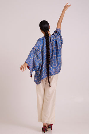 • An easy flow of movement meets quiet elegance. The sabrina set features an electric-blue silk top with a cloud-like drape, paired with ivory wide-leg pants that add a touch of calm contrast. Effortlessly refined and quietly striking, it’s made for the woman who dresses with ease but always leaves an impression.