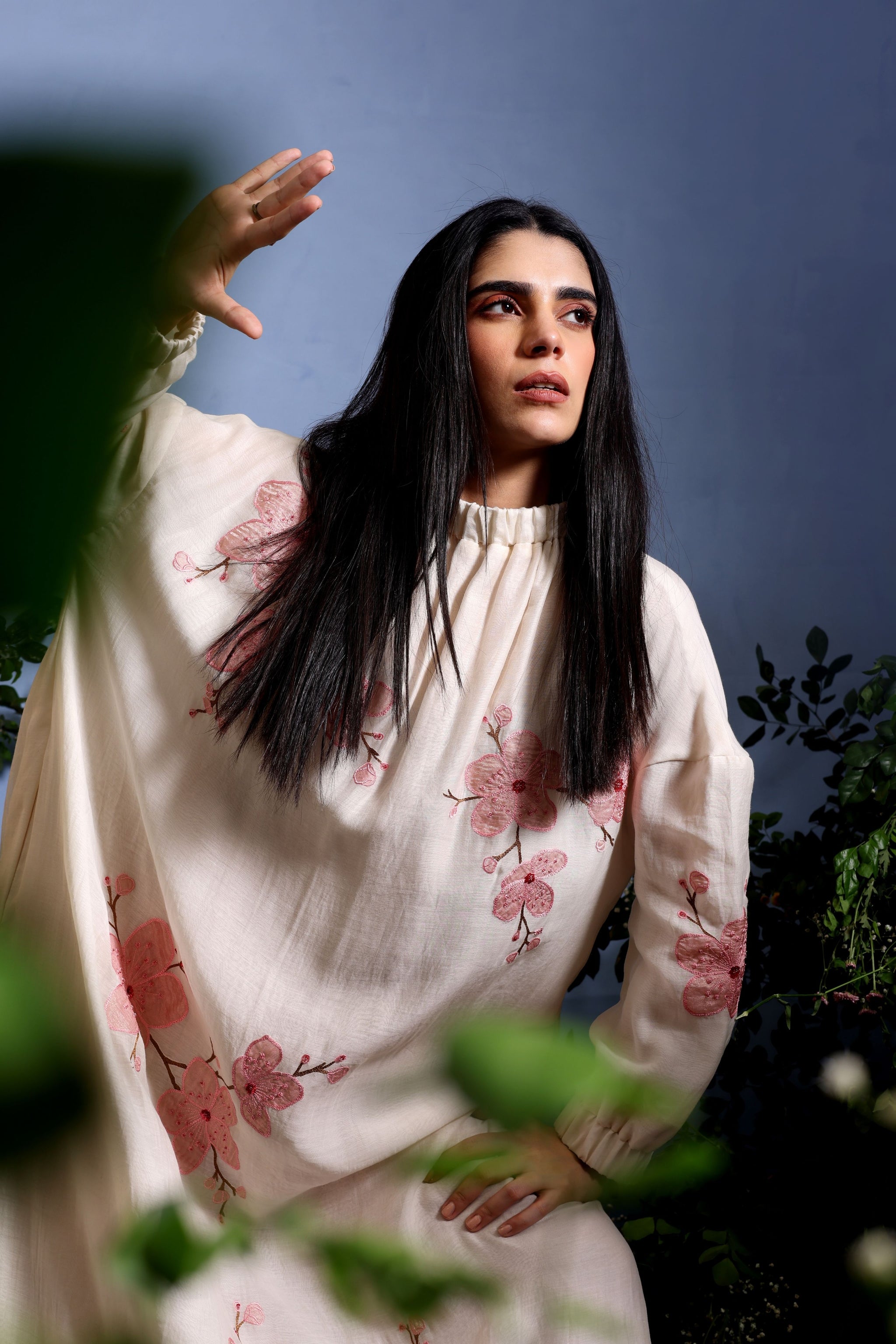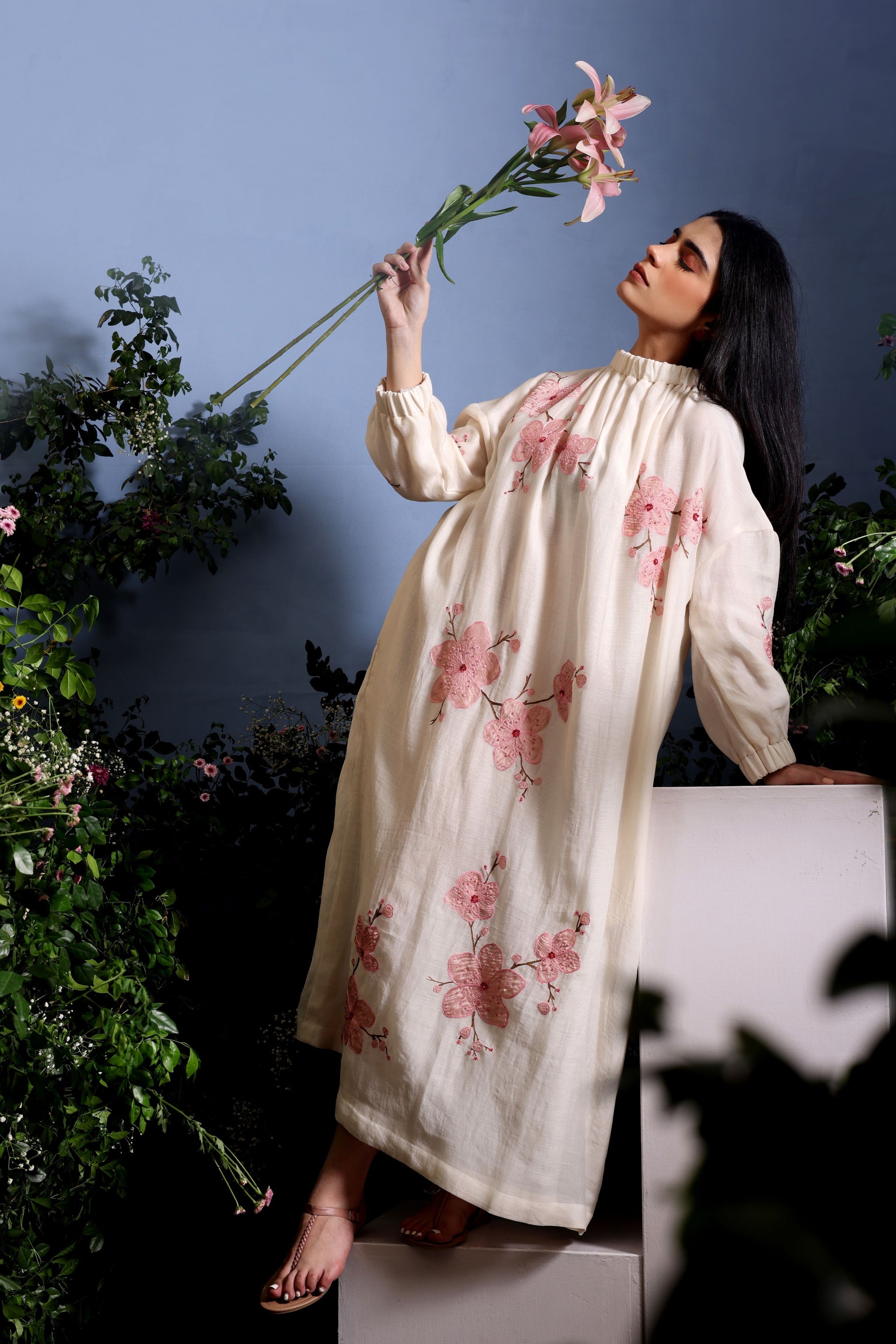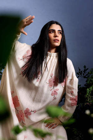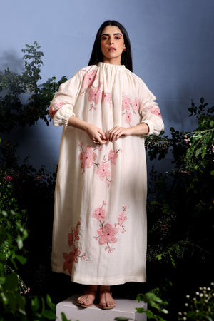 • Pure Malai Chanderi long dress adorned with hand-appliqued cherry blossom branches using pure crushed tissue. Features an elastic high collar and sleeves for a breezy, effortless summer look.