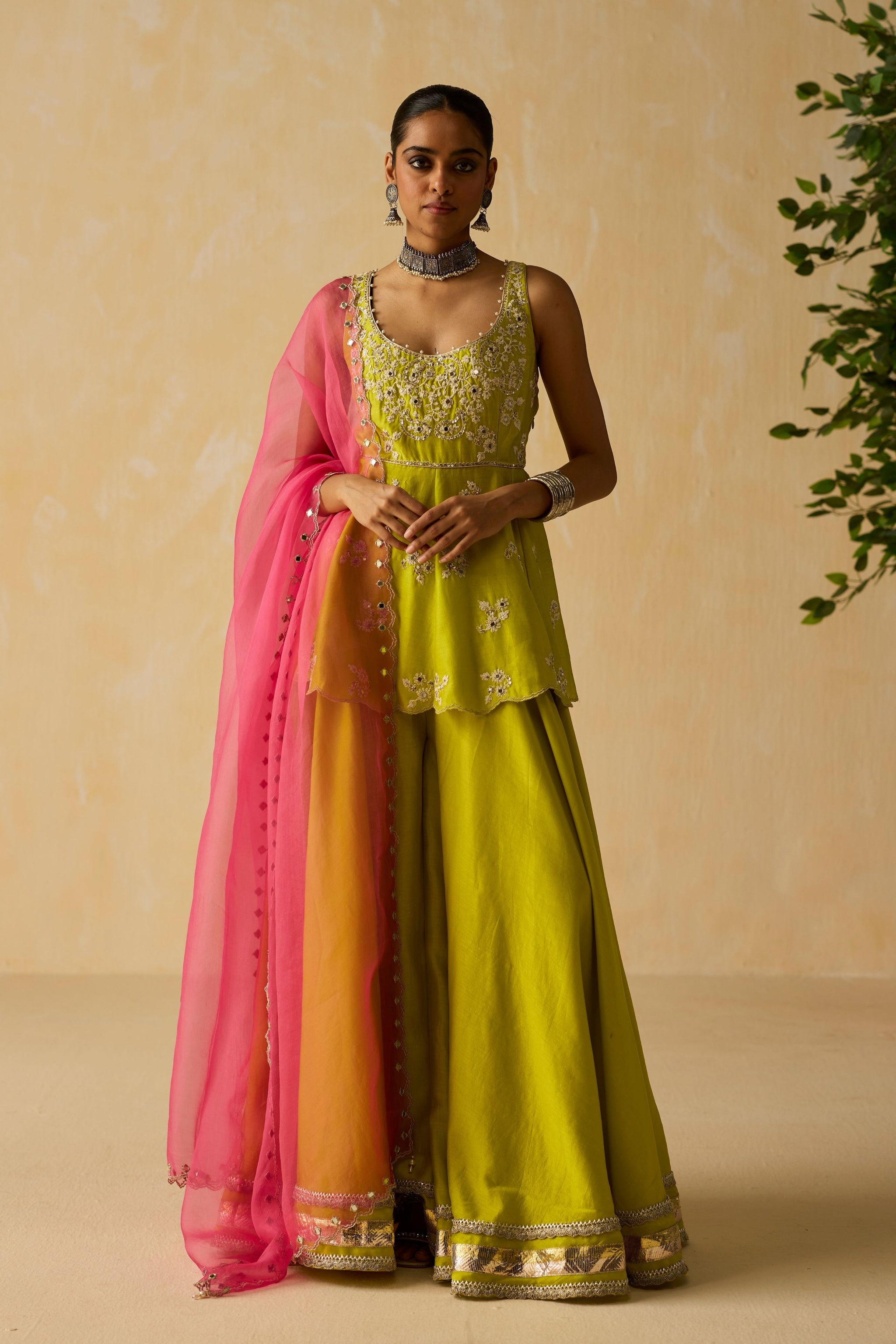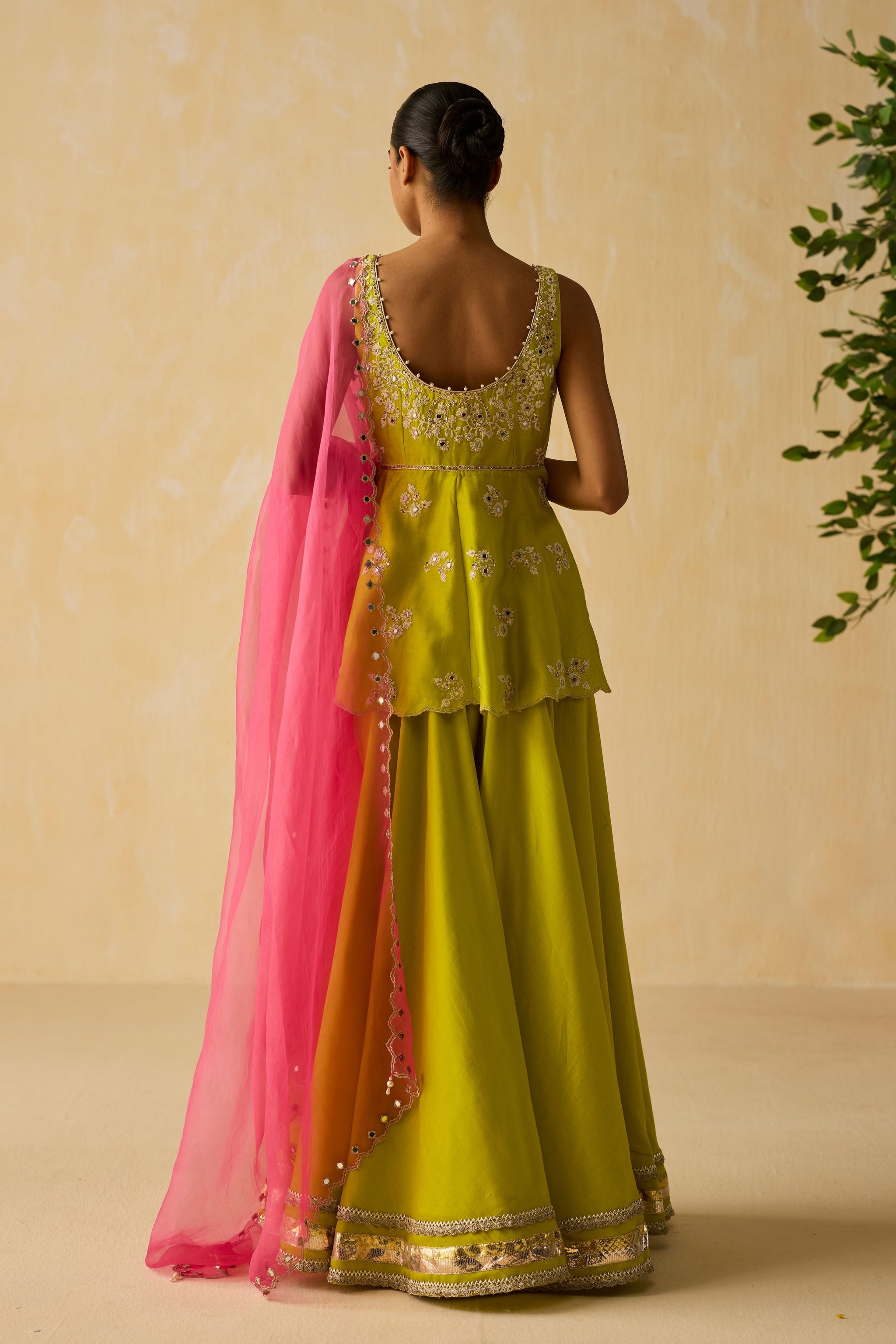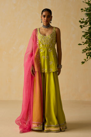 • Lime green dori & hand embroidered peplum in silk chanderi fabric. Paired with embroidered silk organza pink dupatta.
