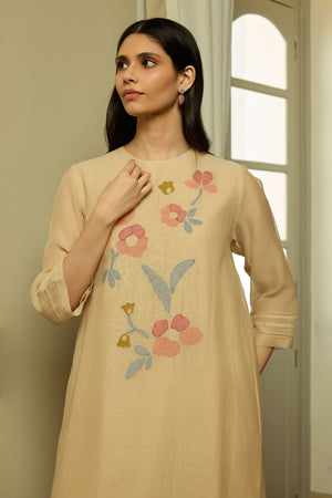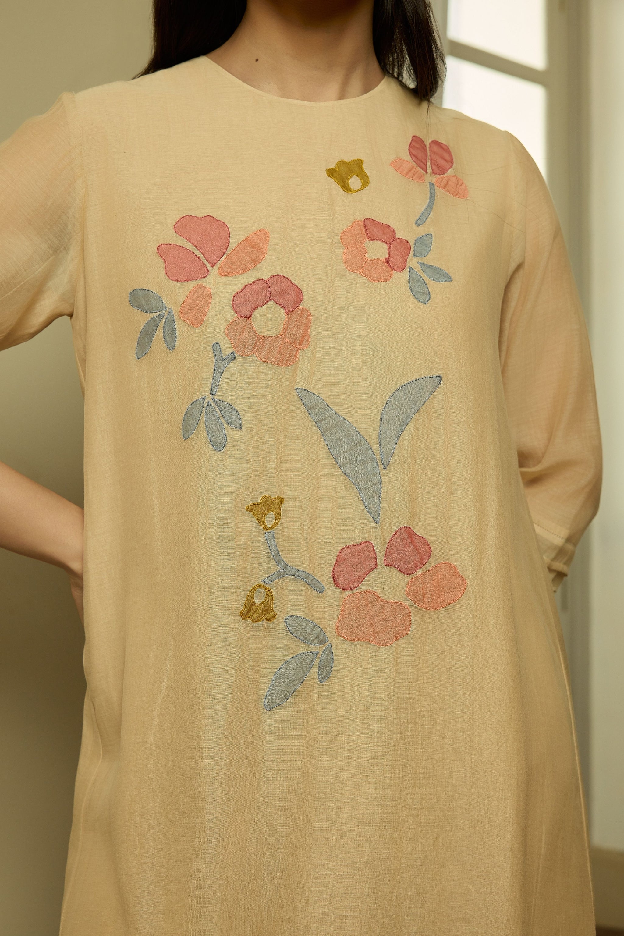 • The sand applique tunic set is detailed with delicate applique blooms placed at the front of the kurta and voluminous sleeves with delicate pintucks, lending a subtle handcrafted touch. The matching pants carry coordinating applique accents, creating a look that feels balanced and easy to wear