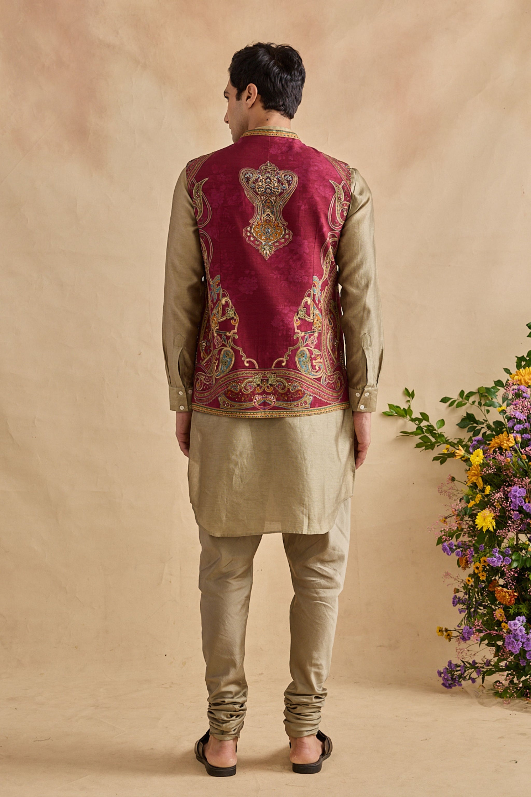 • Featuring a stylish saransh set in vintage paisley inspired motif.Alluring detailing along the placket and the neckline in combinations of colour, paired with a coordinated matching churidar and kurta . Perfect outfit to ace that royal look. The kurta length is 45 inches, the bundi length is 28 inches, and the churidar length is 55 inches.
