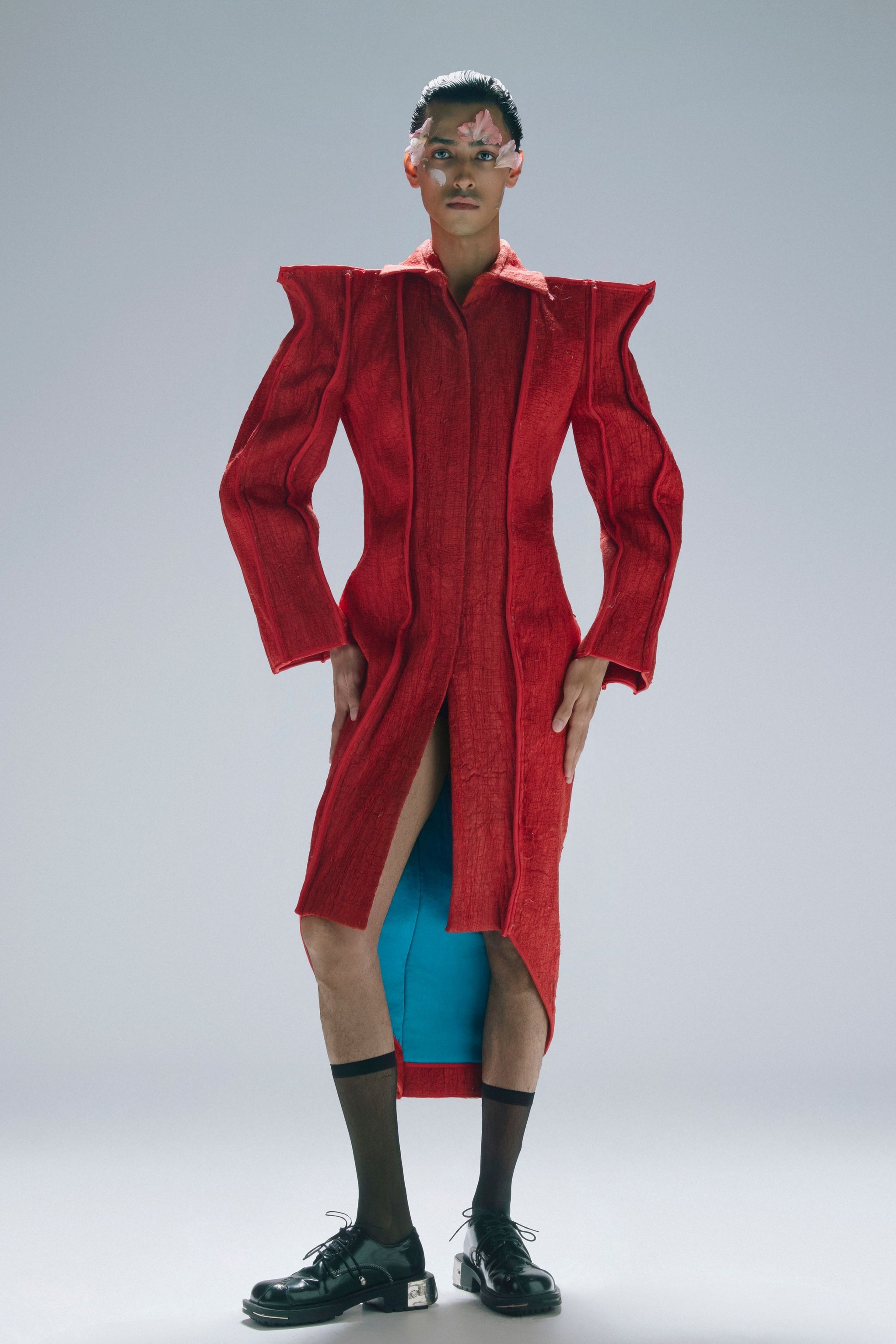 • Commanding attention with its architectural silhouette, this dress is an avant-garde masterpiece that merges structure with movement. The striking red hue, creates a bold, futuristic aesthetic, while the sharp, winged shoulders and tailored lines exude power and confidence. A daring front slit reveals an electric blue underlayer, adding an unexpected dimension of contrast and depth.
