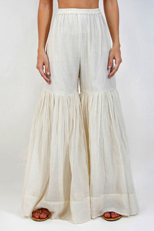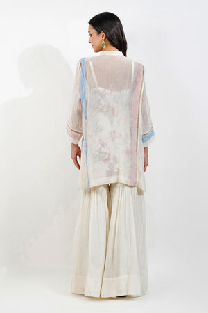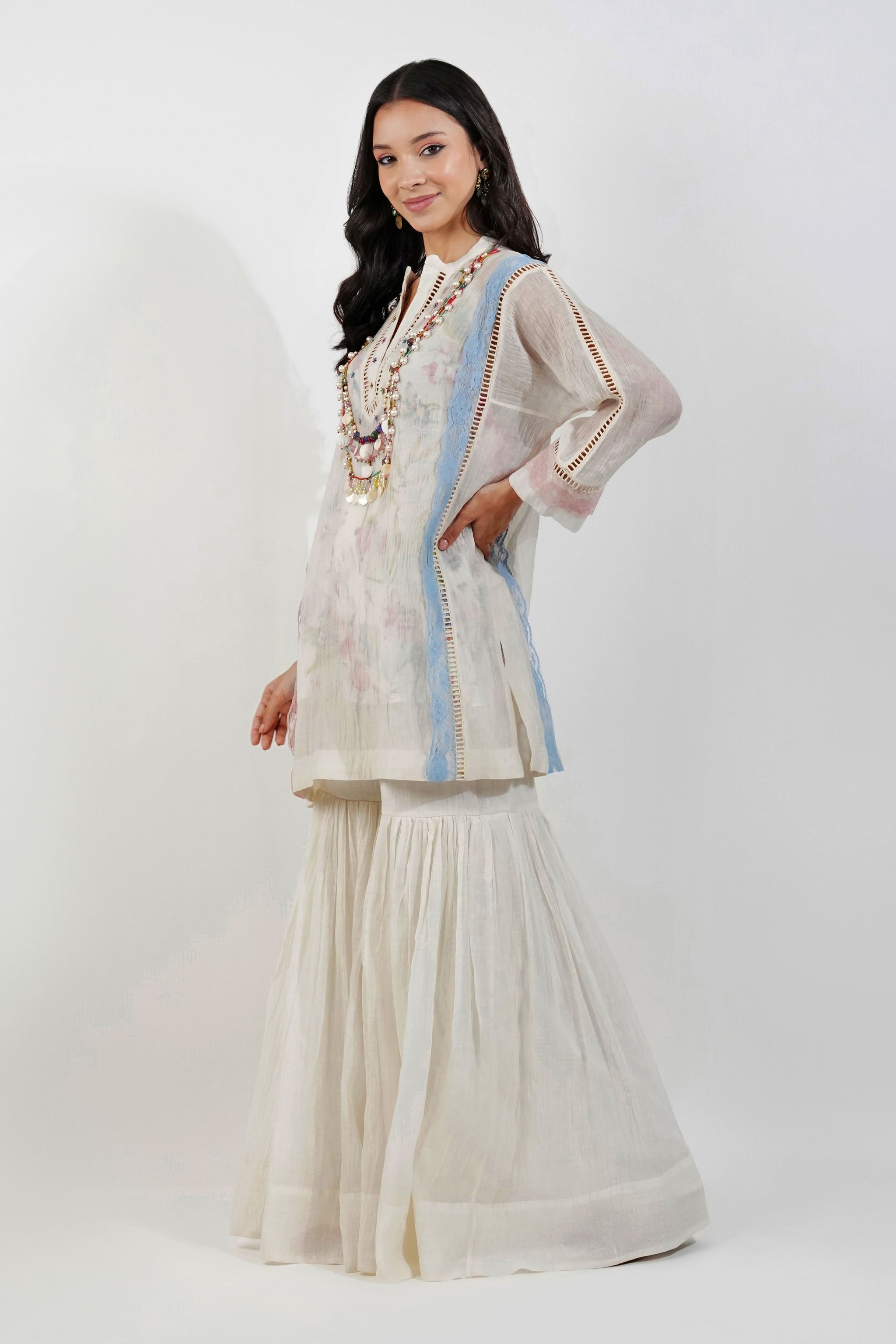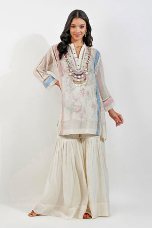 • Chanderi panelled kurta with an eclectic neckline embroidery. Detailed with multiple laces to give it a romantic touch. It is paired with chanderi garara pants and striking chiffon dupatta. Kurta comes with a printed slip.