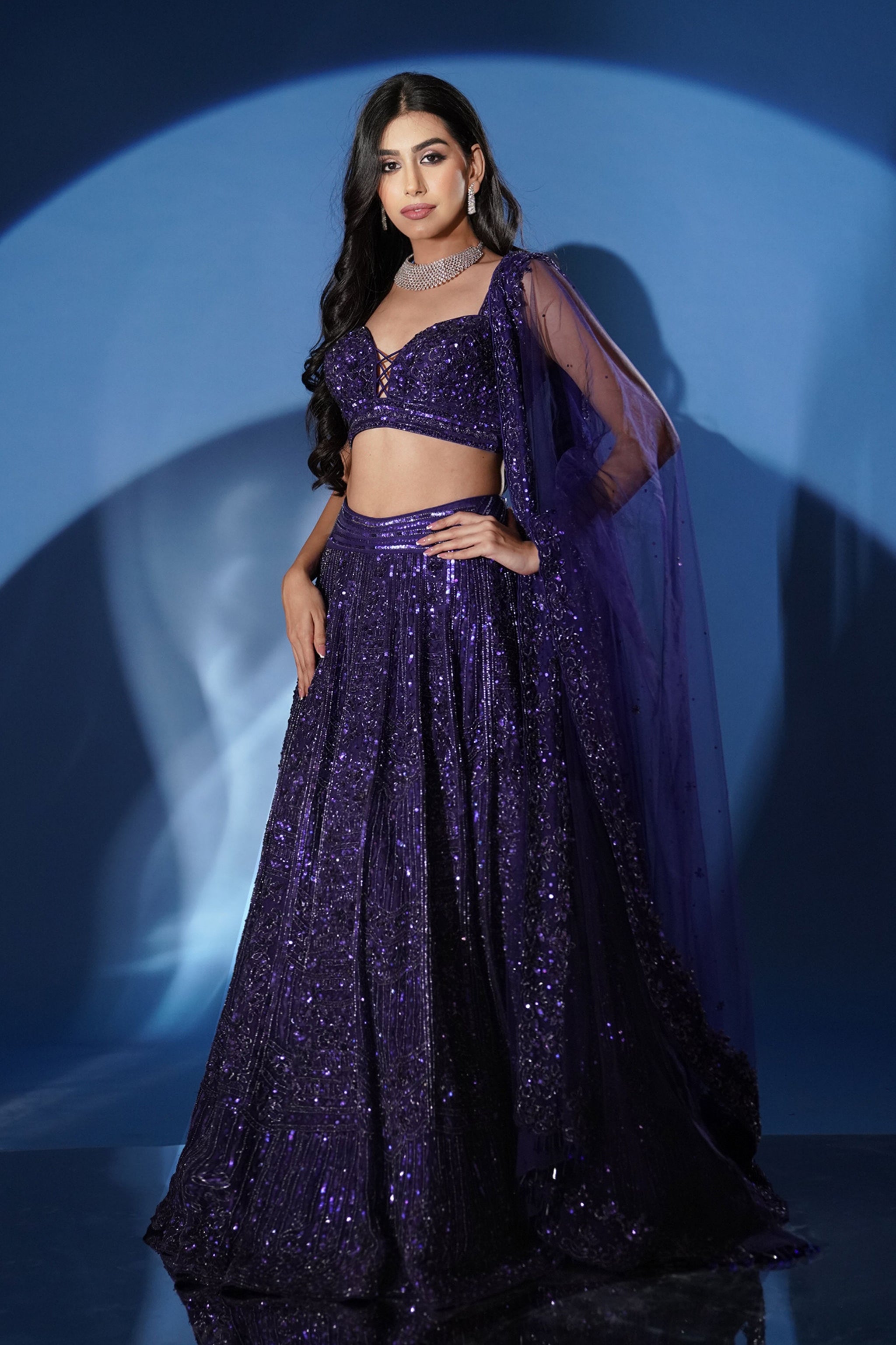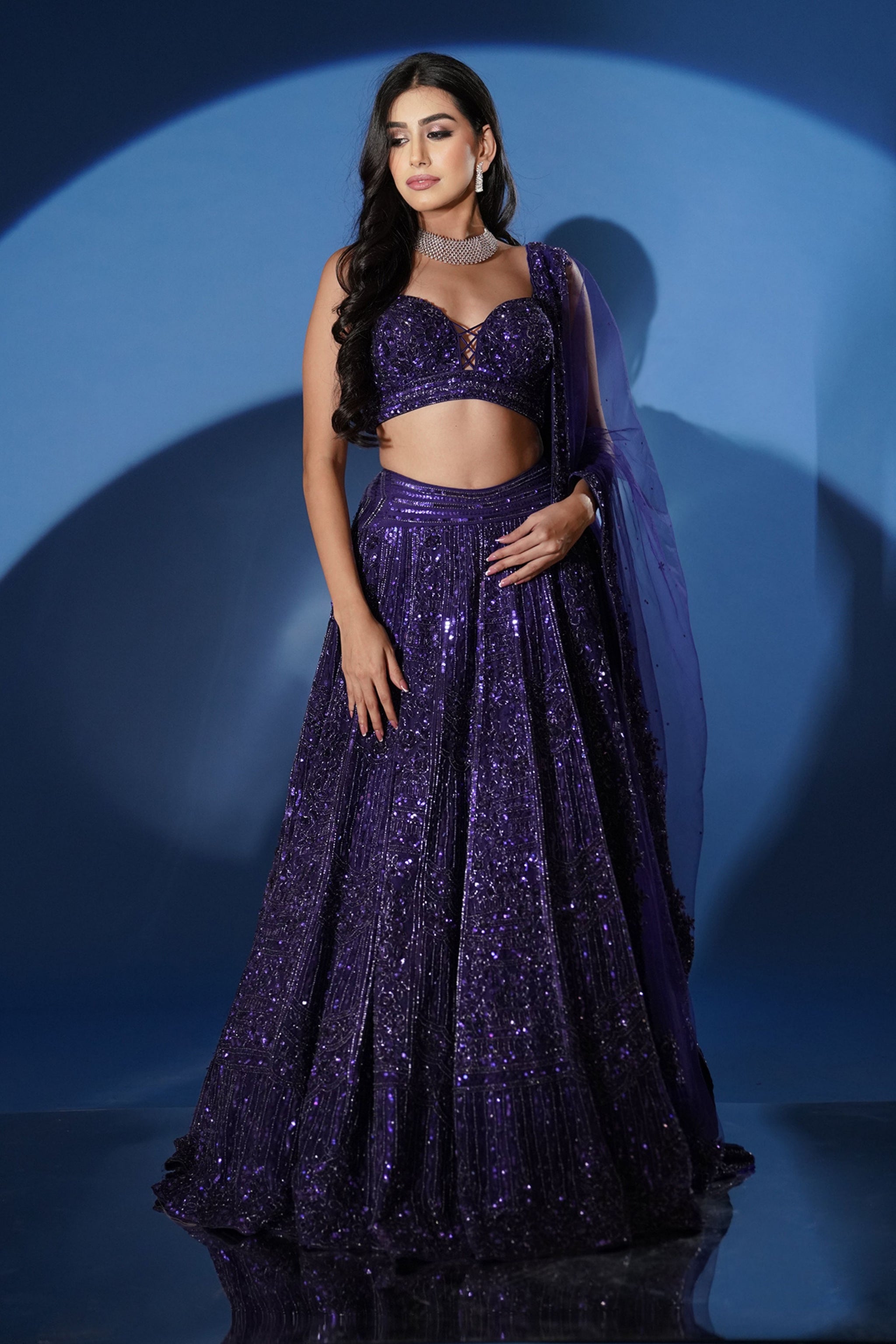 • Enveloped within the luminous allure of electric blue, this hand embroidered lehenga is crafted to dazzle under the spotlight. The voluminous skirt comes alive with an opulent interplay of sequins, cutdana, and beads, creating a rhythmic sparkle that celebrates every twirl and every beat of the night.The sculpted blouse echoes the same brilliance with intricate embellishments and striking criss cross detailing that elevates its contemporary silhouette, while the sheer net dupatta offers a soft, graceful balance to the high shine glamour.