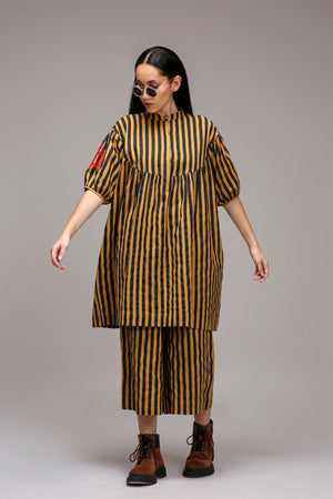 • The classic acra tunic set features a relaxed, kaftan-style tunic crafted from soft, handspun cotton with hand-block printed stripes. The sleeves are beautifully detailed with intricate joker thread hand embroidery, adding a touch of artisanal charm. Designed with a front button opening and side pockets, it offers both comfort and functionality. The set comes with matching striped capri pants featuring a full elasticated waist and side pockets making it a complete and effortlessly stylish look.
