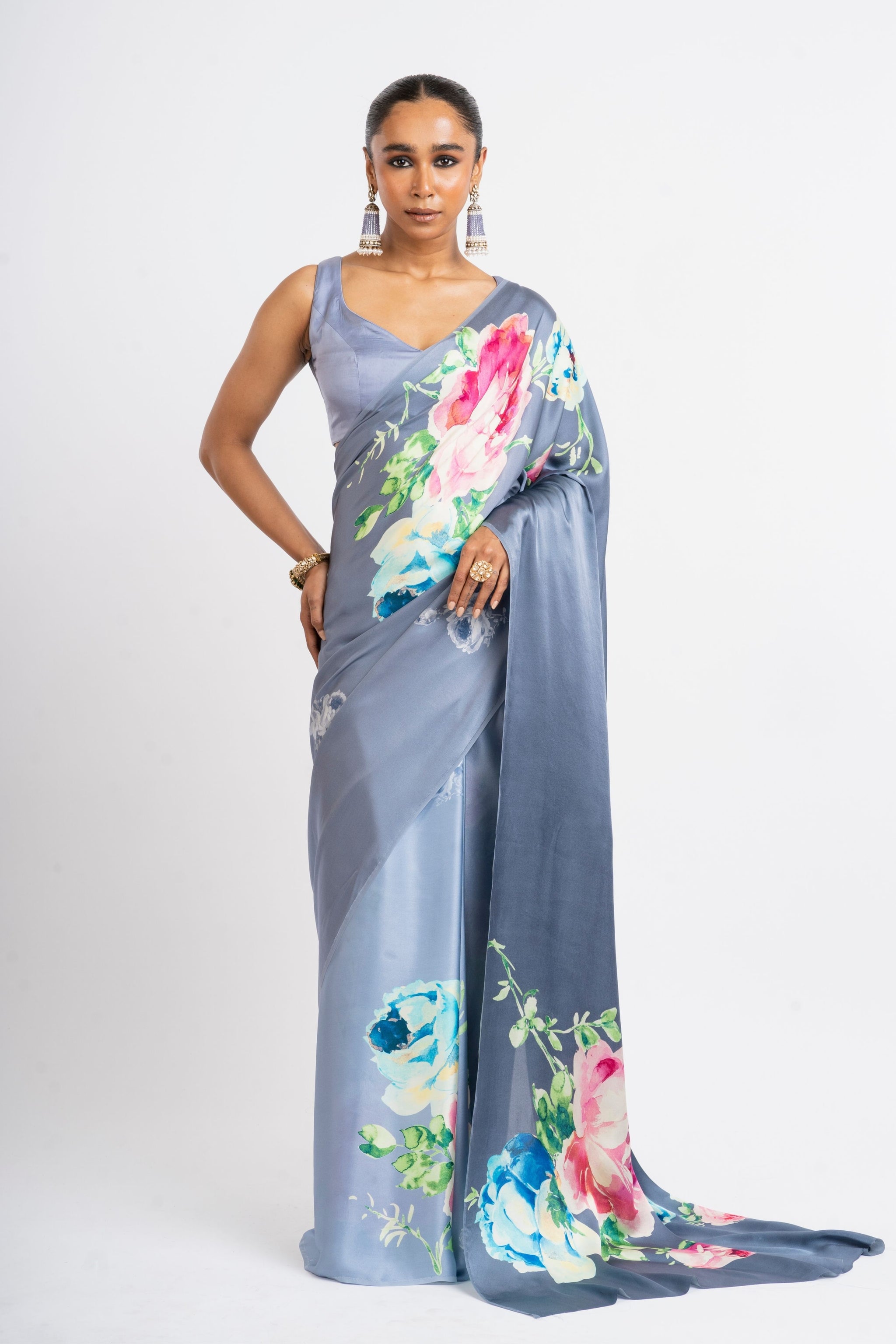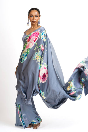 • A blend of luxury and artistry, this satin silk saree features a French grey base with bold, digitally rendered abstract flowers. The hand-painted details in vibrant colors create a striking contrast against the elegant background.