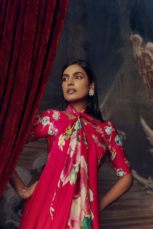 • A blend of luxury and artistry, this satin silk saree features a magenta pink base with bold, digitally rendered abstract flowers. The hand-painted details in vibrant hues create a striking contrast against the rich, vivid backdrop.