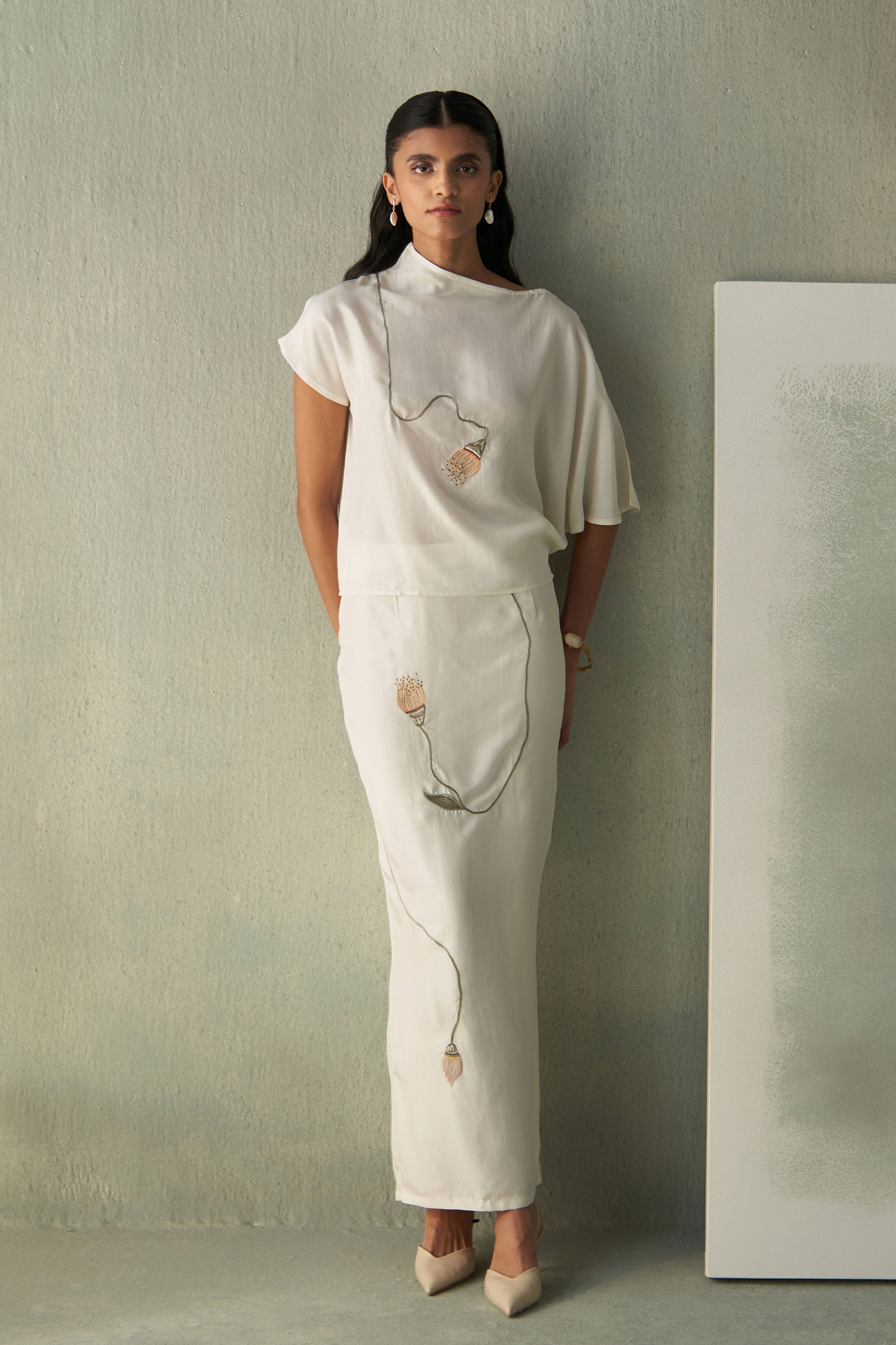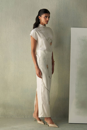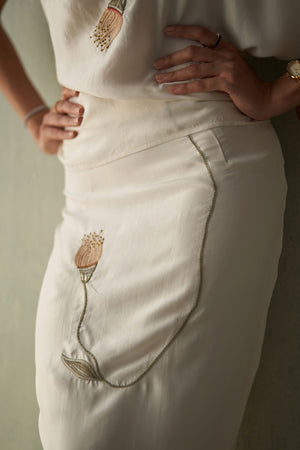 • Crafted in fluid ivory silk, this straight-fit skirt embodies refined simplicity. It features delicate hand embroidery of a trailing pod motif that winds gracefully along the length, adding a touch of poetic detail. Finished with a clean back slit for ease of movement, it pairs effortlessly with the matching sicily silk top for an elegant, elongated silhouette.