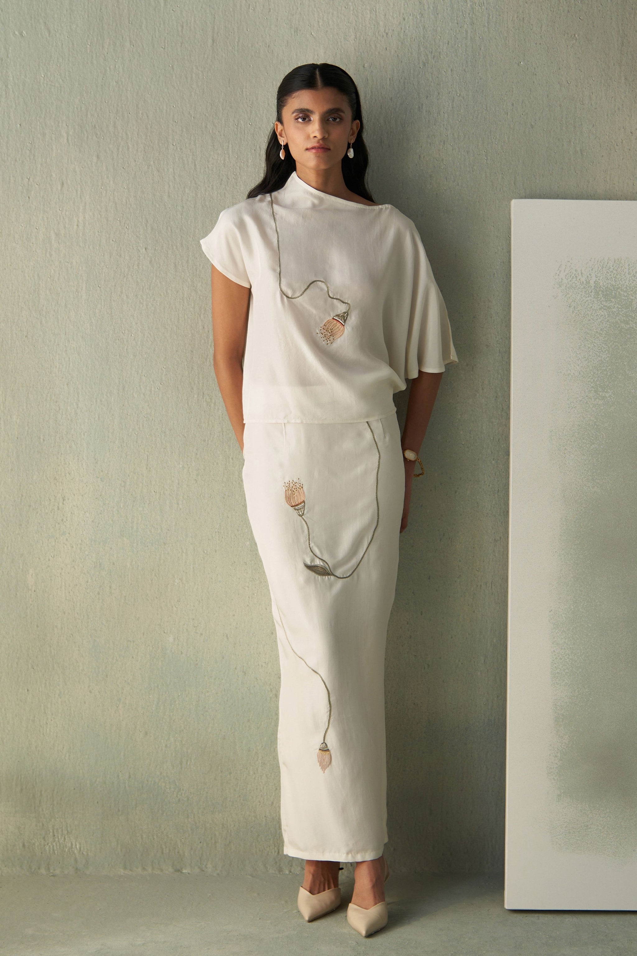 • Crafted in fluid ivory silk, this asymmetric top drapes beautifully across the shoulders, with an asymmetric neckline, blending ease with sophistication. The soft silhouette is elevated with delicate hand embroidery of a blooming pod motif — a signature pea in a pod detail. Effortless yet refined, it transitions seamlessly from day to evening with timeless elegance.