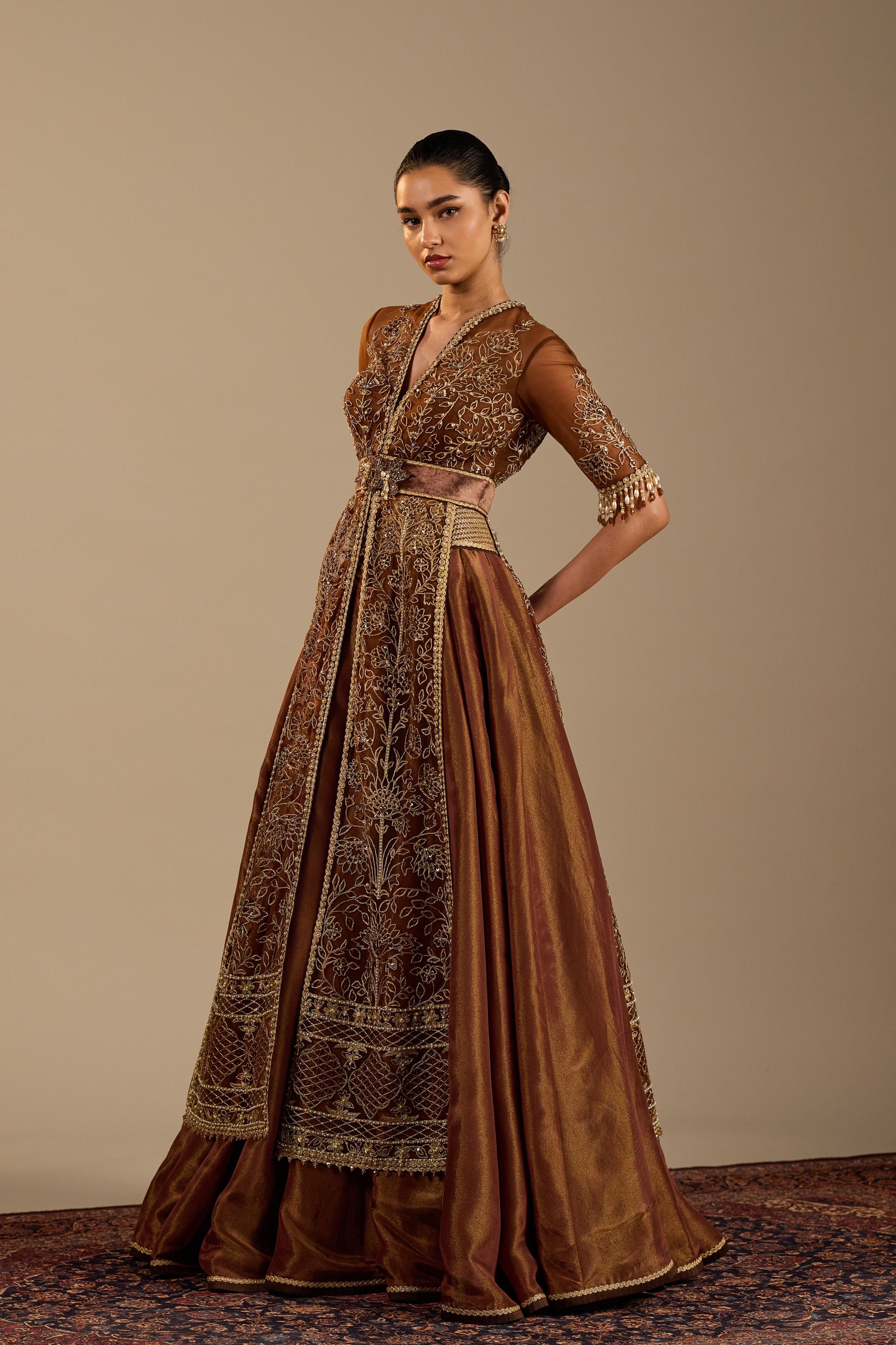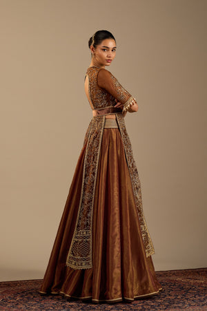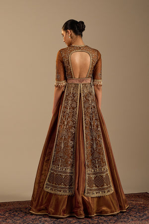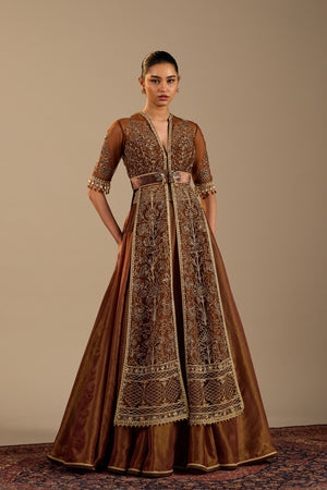 • Our signature four panel embroidered jacket in copper gold shade. It is paired with tissue skirt in complementing shade.