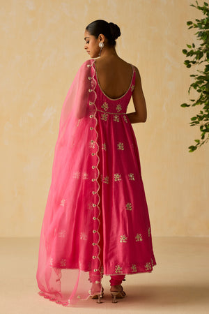 • Pink dori and hand embroidered silk chanderi anarkali. Paired with dola silk churidar.