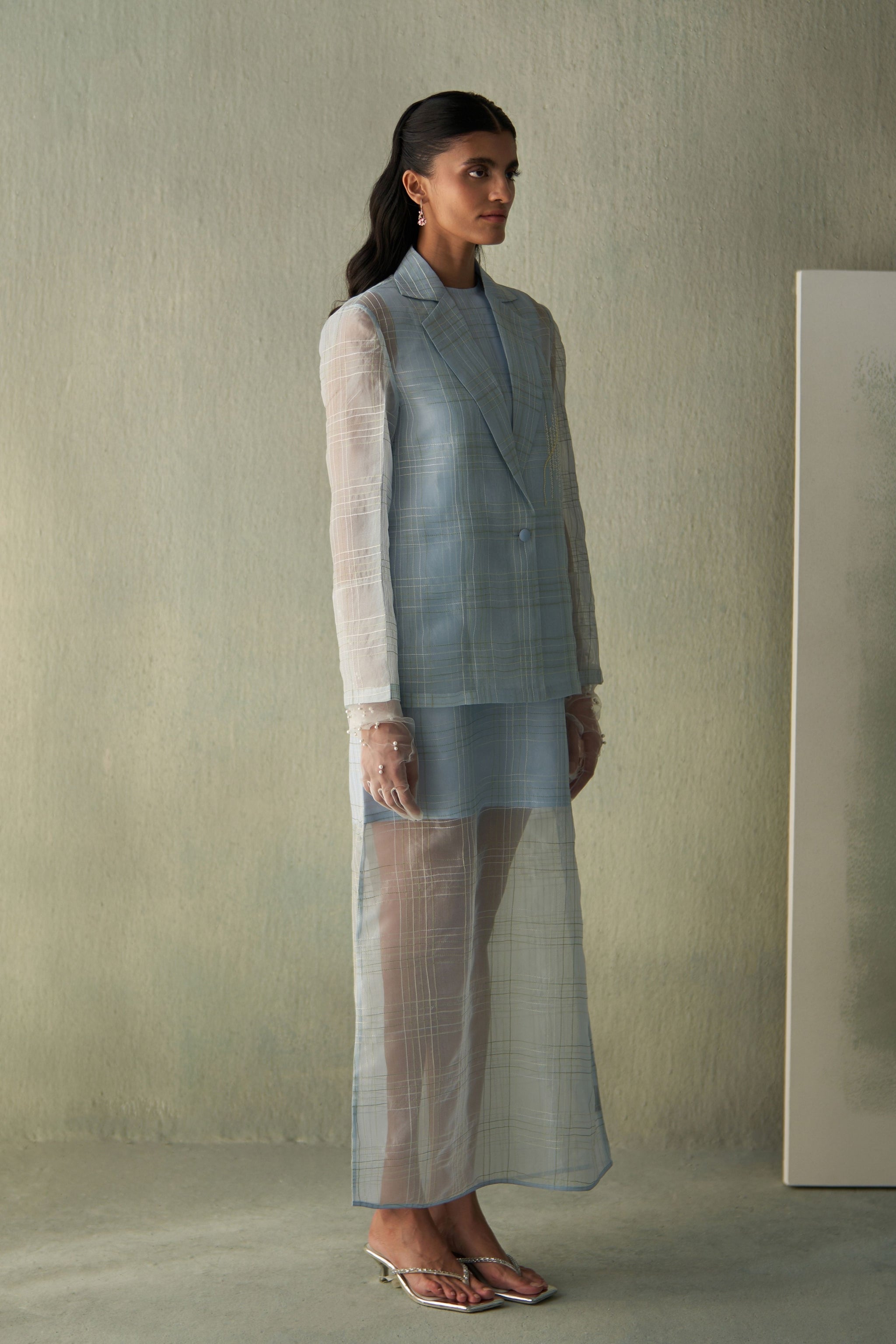 • A poetic take on power dressing, this sky-blue sheer jacket is tailored in delicate organza with an over-all handcrafted linear check. Its soft structure is elevated with tonal fabric buttons and a touch of hand embroidery in pastel threads. Perfect to be layered over the sky semi-sheer dress for a refined monochrome look.