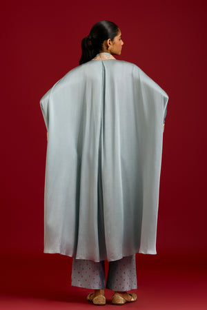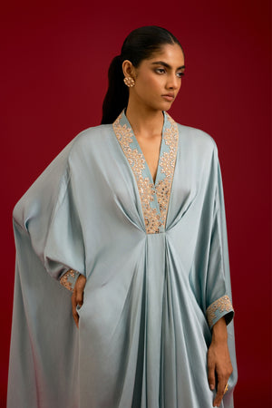 • This chic grayish blue kaftan set showcases a luxurious modal satin kaftan adorned with delicate dori embroidery, shimmering mirror work, and subtle sequins, paired with a bandhej palazzo pant. This design offers a relaxed yet glamorous look, ideal for festive gatherings or evening events.