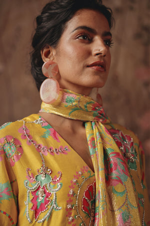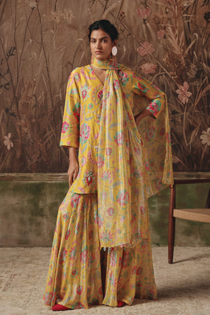 • A sun-washed suit set inspired by bakhtar’s warm horizon tones, where dawn light meets wandering florals. The v-neck kurta falls with effortless grace, paired with a fluid sharara and a soft crinkled dupatta that adds quiet movement. Radiant yet easy, this is festivewear shaped for comfort and glow.