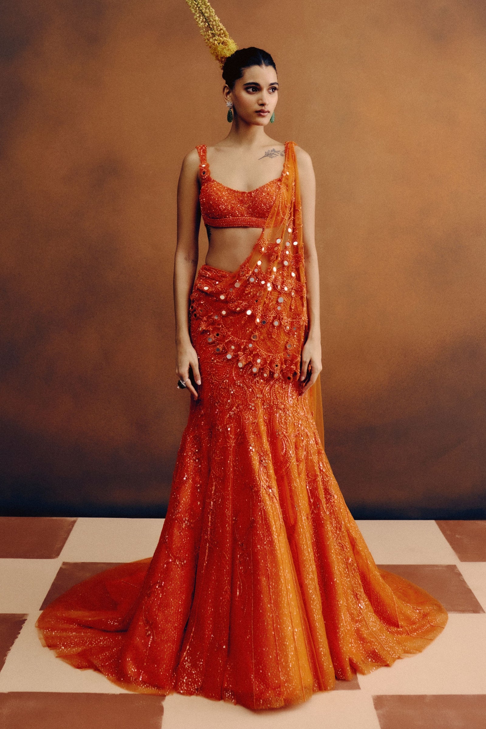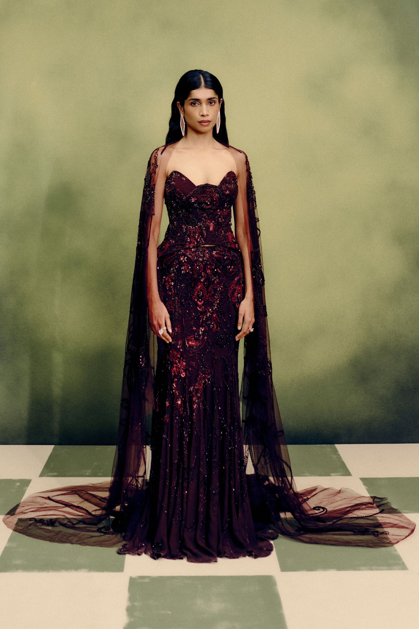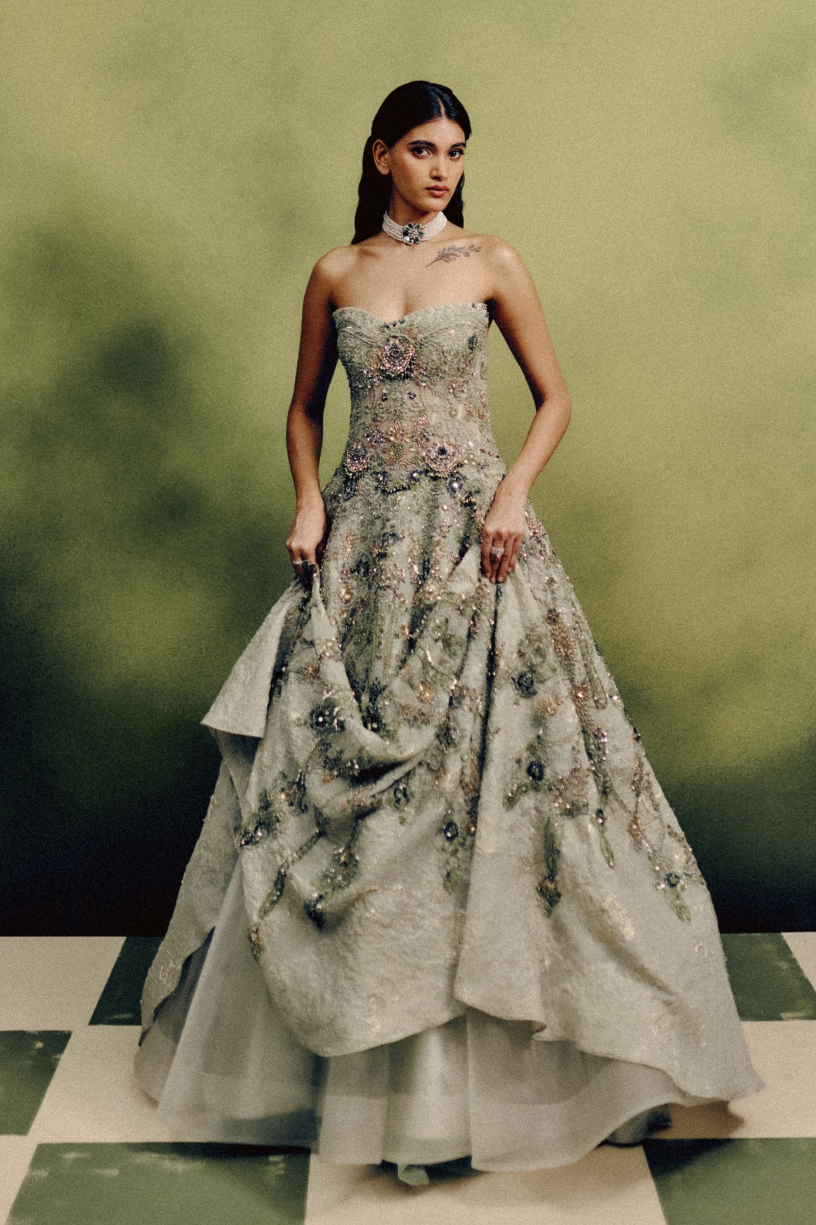 • A vision of deep allure, this neon navy ball gown is exquisitely hand embroidered, with each stitch echoing a refined artistry. The organza neckline detailing adds an airy elegance, framing the silhouette with sculptural grace and modern couture sophistication.