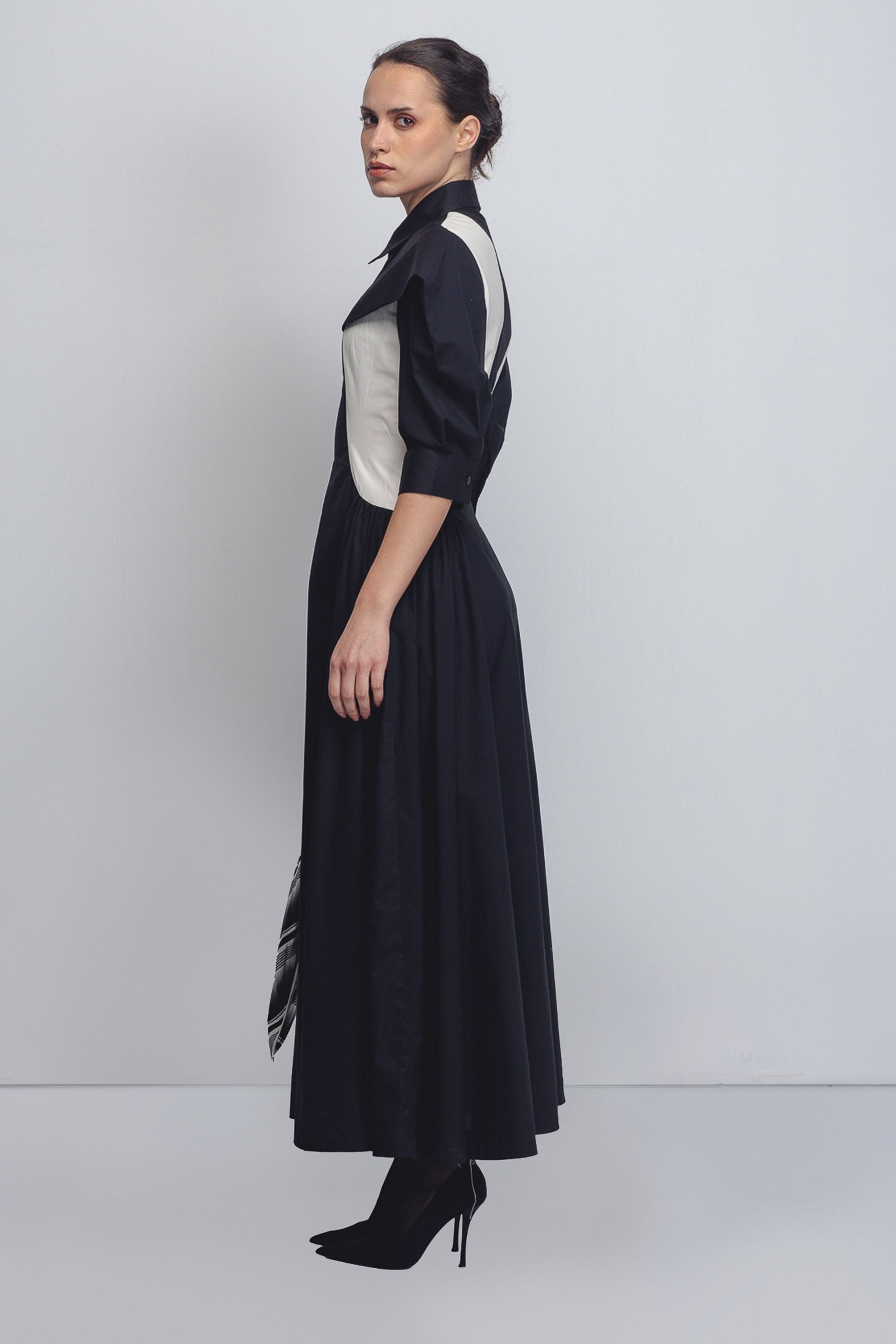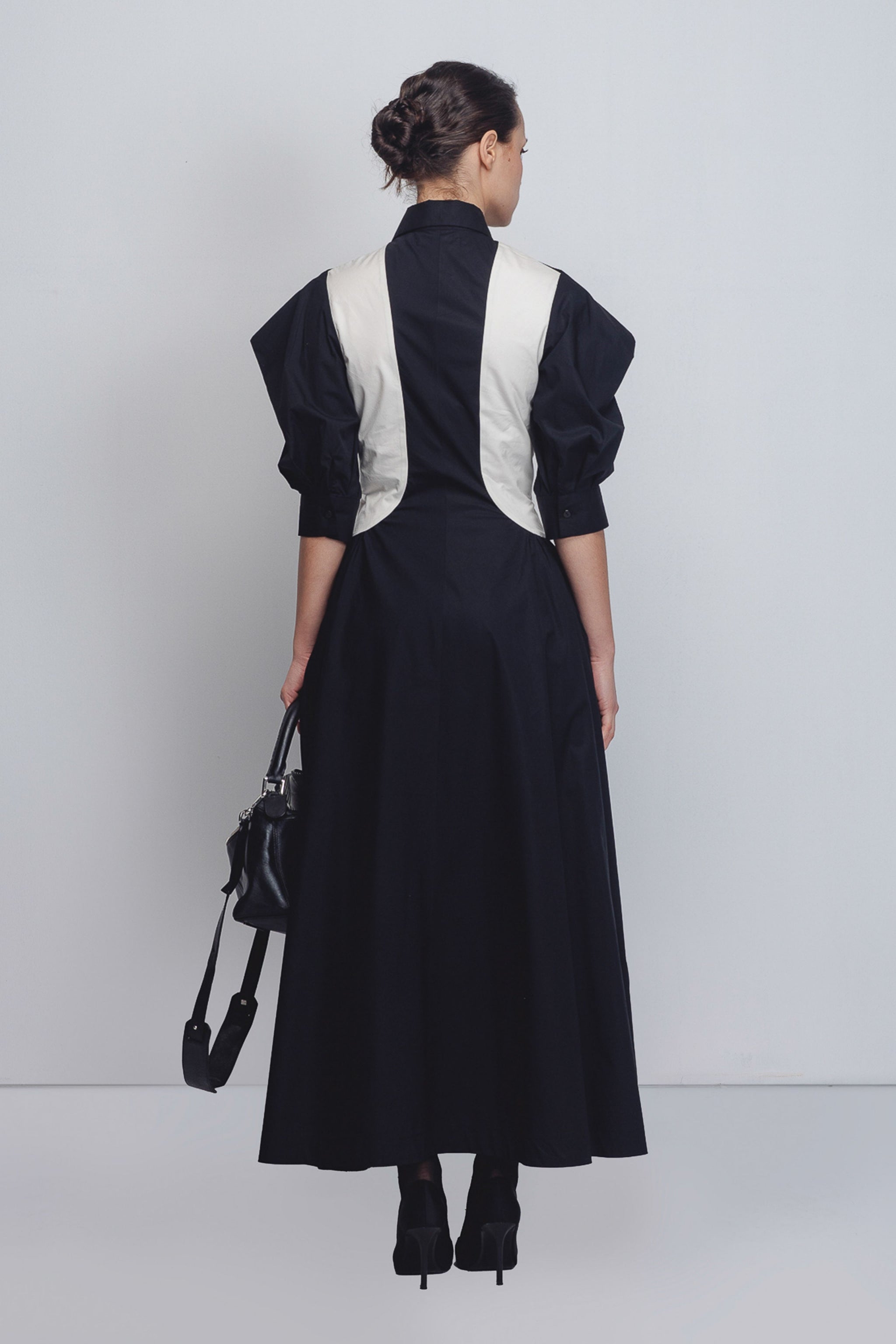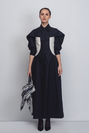 • Crafted from 100% Cotton , this architectural fit-and-flare dress features a monochrome palette defined by curved off-white panels that create a striking visual contour against the deep black base.The design is anchored by a sharp collar and a front zipper, transitioning into sculptural sleeves that create a bold, three-dimensional silhouette. 55"