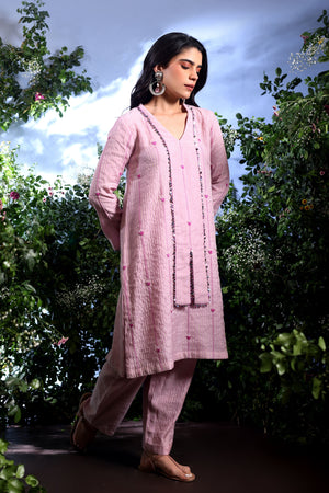 • Celebrate the serene bloom of spring with this pure stripe tissue Malai Chanderi long V-neck top, featuring hanging plackets adorned with multicolored brass sequin tassels. Vertical hand-embroidered threadwork stripes with delicate lotus motifs evoke the gentle blossoming of lotus flowers in spring. Paired with pure stripe tissue Malai Chanderi flared pants, the ensemble offers a graceful, flowing silhouette that blends artisanal craftsmanship with breezy, seasonal elegance.