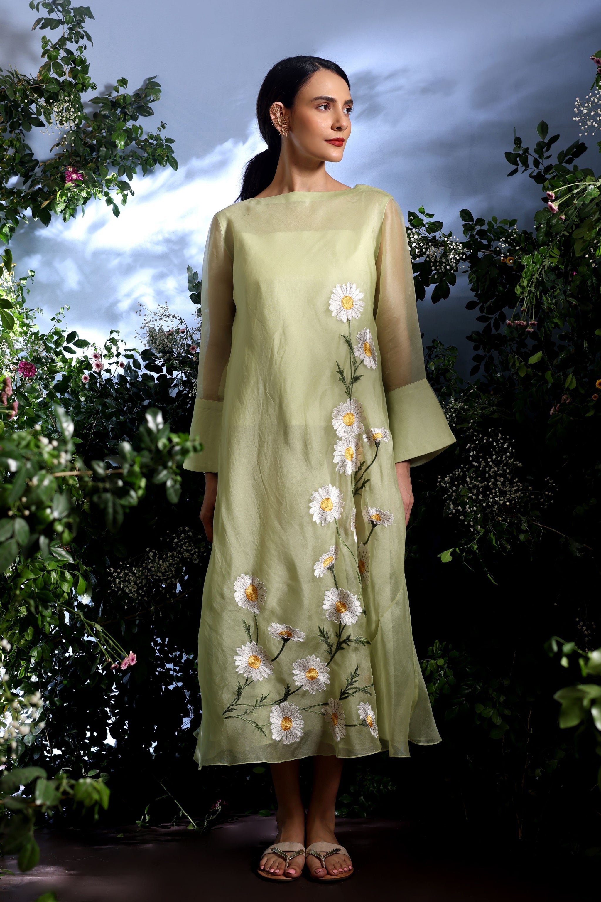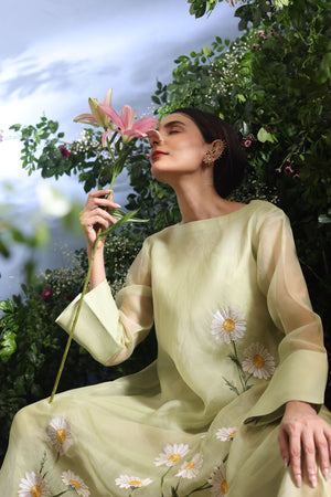 • Crafted in pure silk organza, this long dress features intricate hand embroidery of a blooming daisy flower bunch. Breezy, flowy, and ethereal, it captures the lightness of summer with every step, making it perfect for sunlit days and effortless elegance.