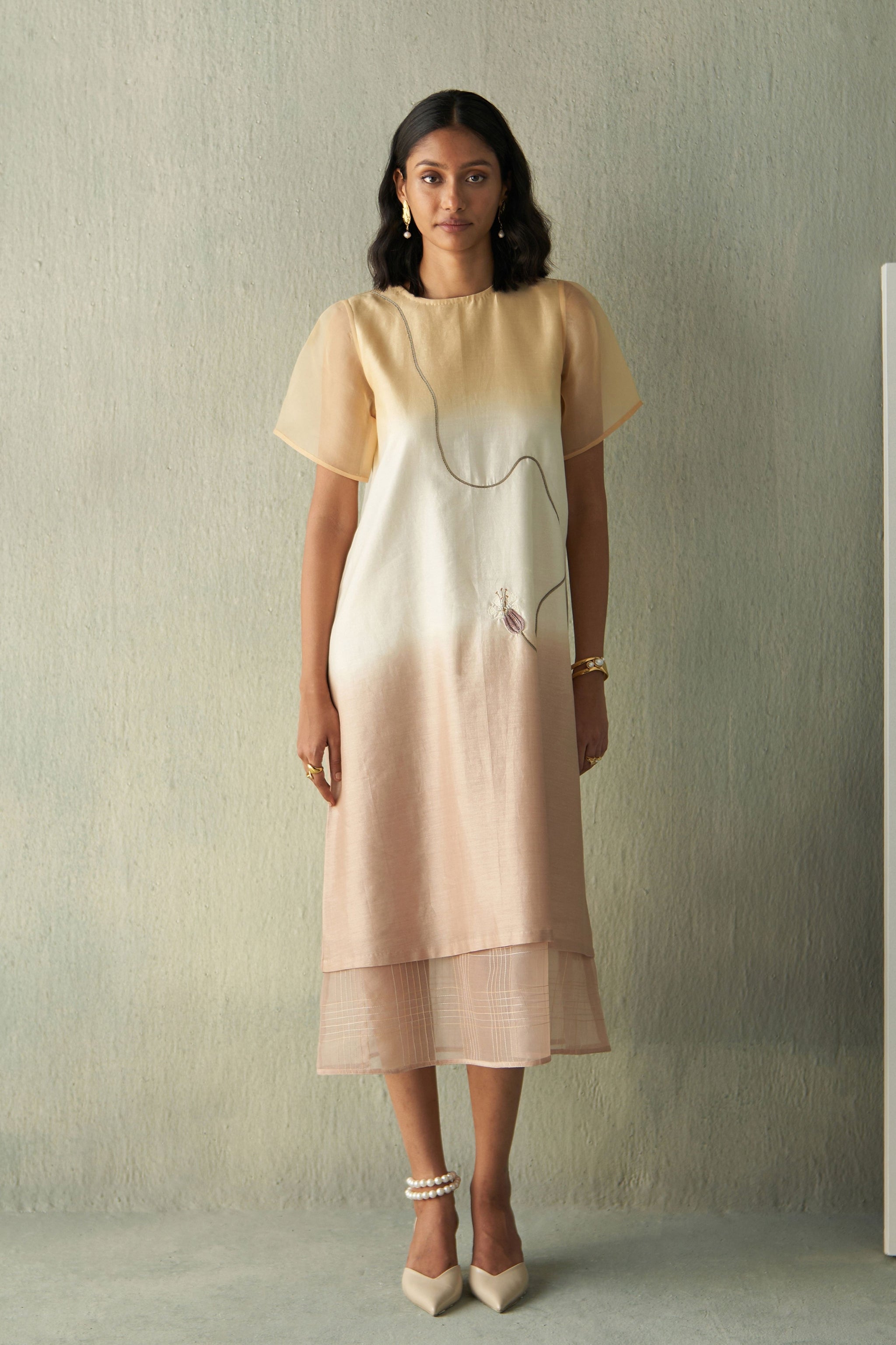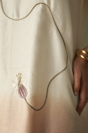 • A serene, ombré chanderi silk dress blending soft sunset peach into ivory and muted blush, featuring airy sheer sleeves and a fluid straight silhouette. Delicate thread work detailing adds an artistic touch, while the layered sheer hem lends subtle structure and movement. Effortlessly elegant, this dress is perfect for refined daytime occasions or intimate evening gatherings.