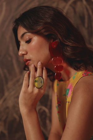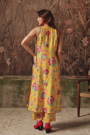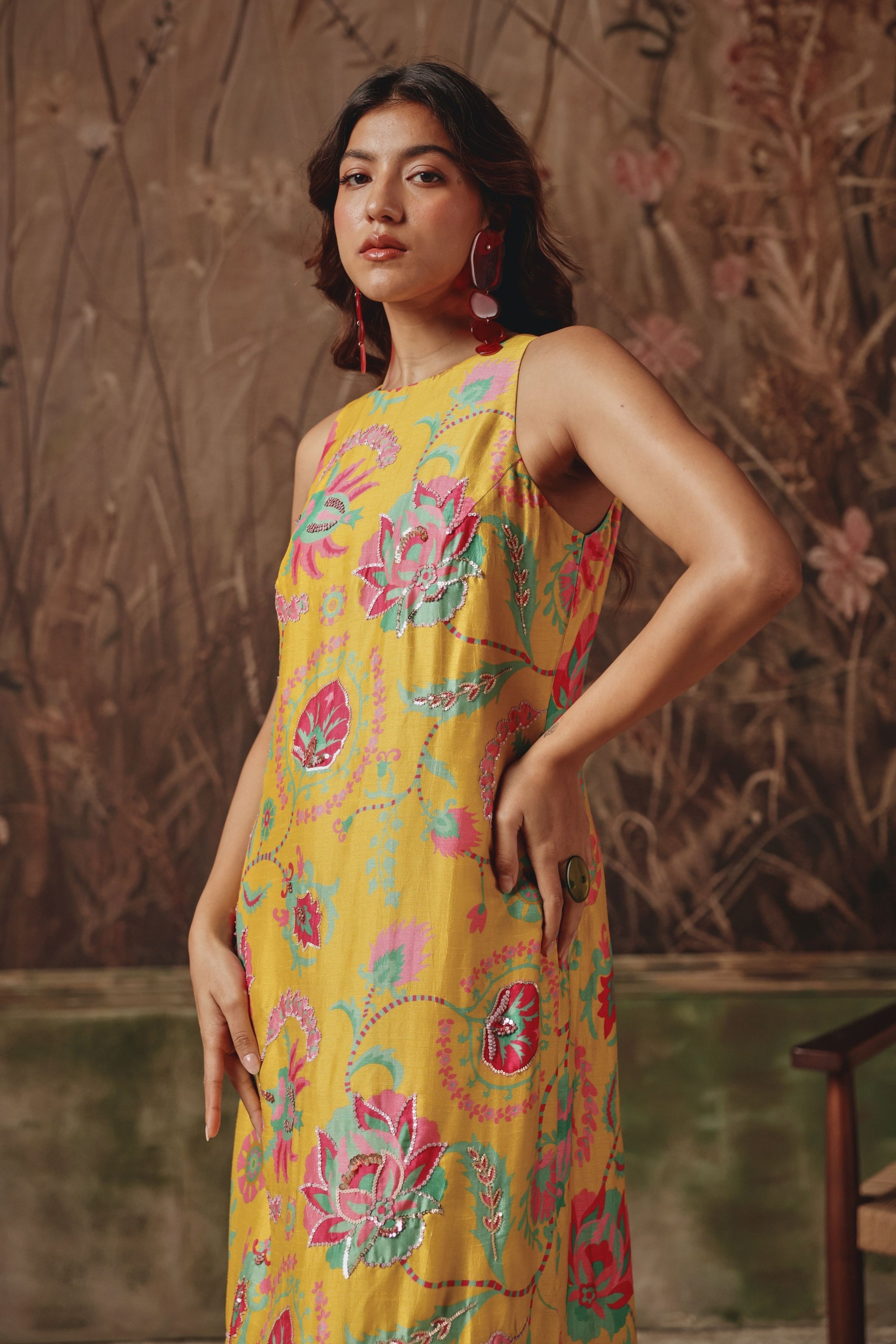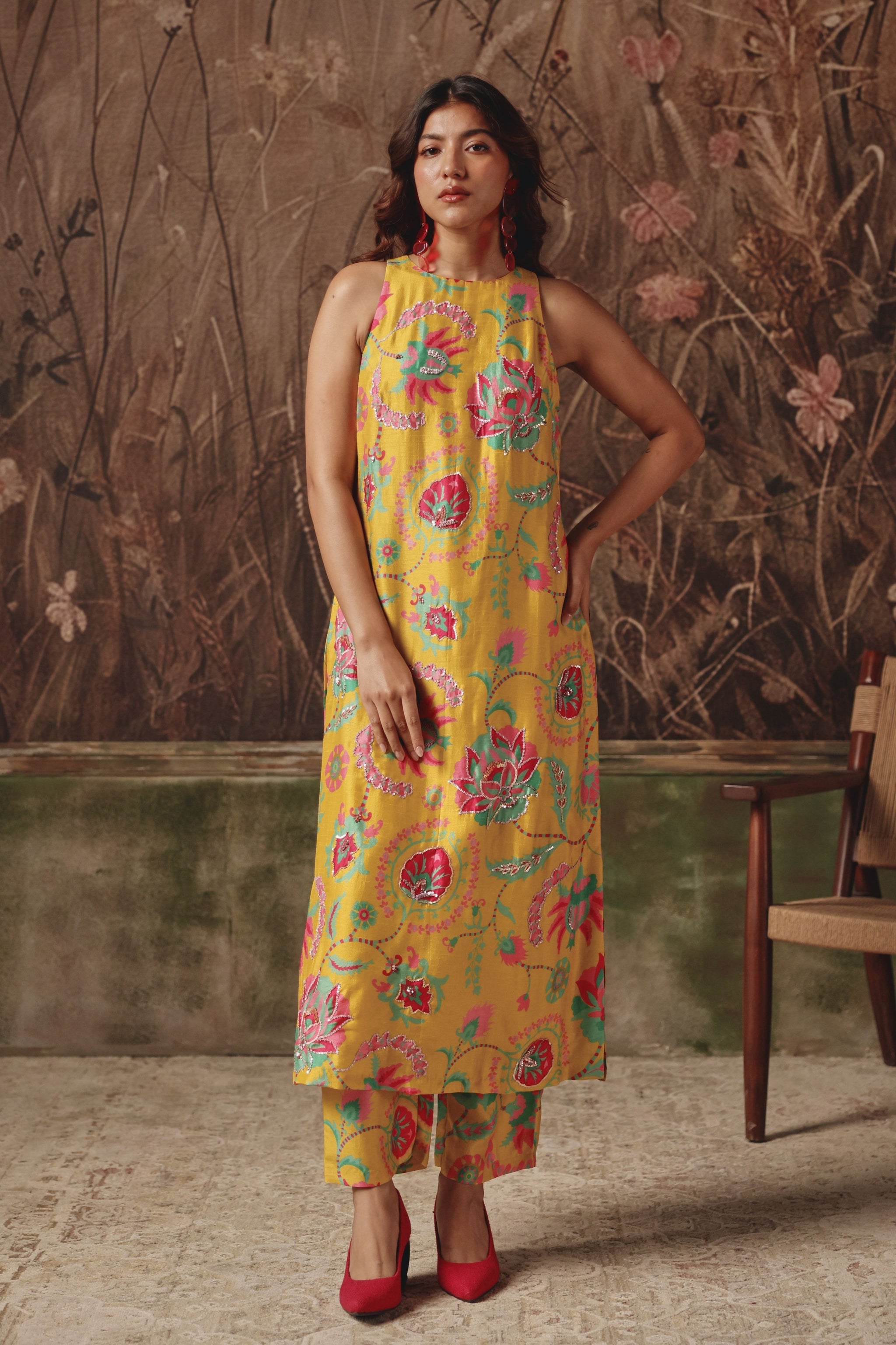 • Sunlit mosaic kurta set is a fresh, contemporary take within the collection — minimal in cut yet rich in colour. A sleeveless, straight kurta in sunshine yellow is adorned with circular and floral motifs that glint softly with sequins, creating a mosaic of light as you move. Matching printed trousers keep the look cohesive and elongated, ideal for warm-weather soirées, sundowners, or relaxed festive get-togethers.