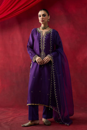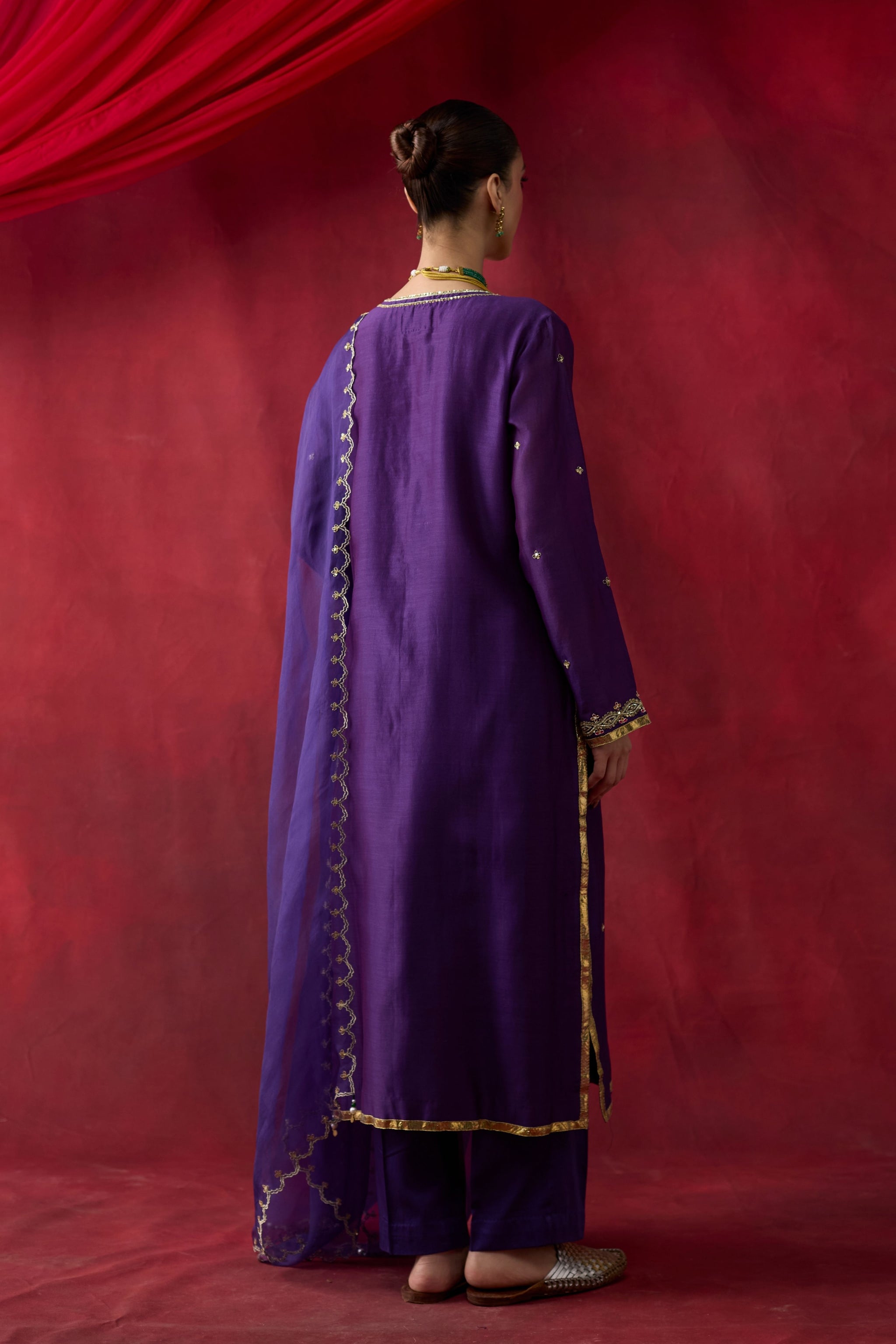 • Pink silk chanderi straight kurta with thread and hand embroidery. Paired with an embroidered silk organza purple dupatta and comes with cotton silk pants.