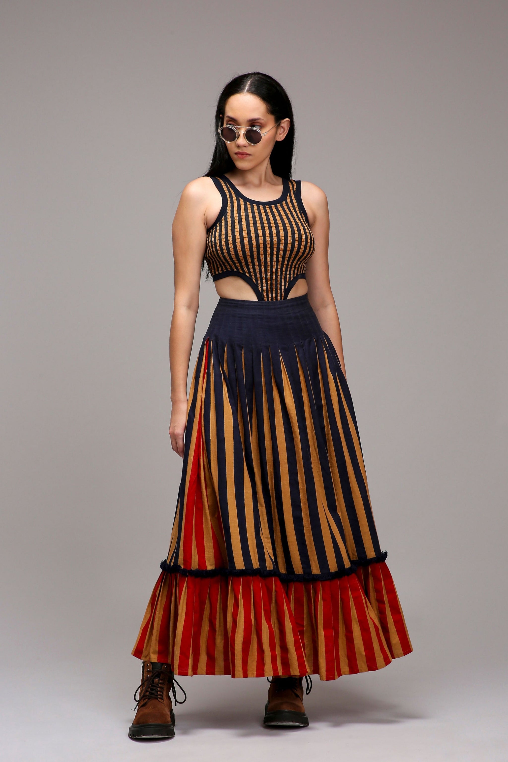 • The skirt is sold separately. Check out Tan-brown Blue Red Dual Striped Skirt
