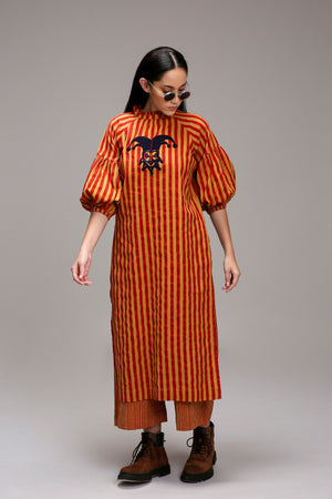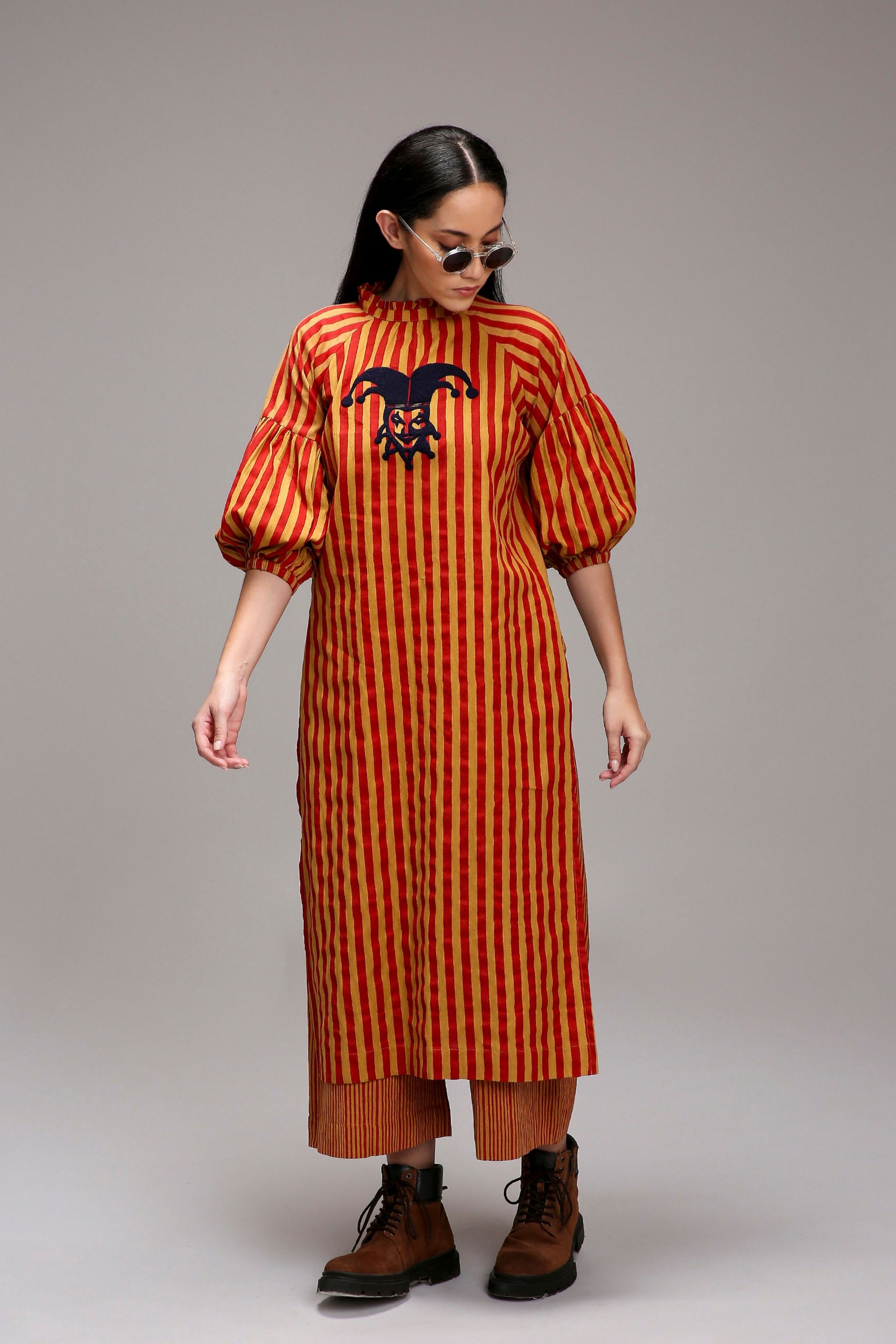 • High-neck raglan tunic featuring a hand-embroidered joker embroidered motif and balloon sleeves with elasticated cuffs. Crafted in handspun cotton with an all-over hand-blocked striped print. Pair it with matching striped pants from the collection for a bold, coordinated look.